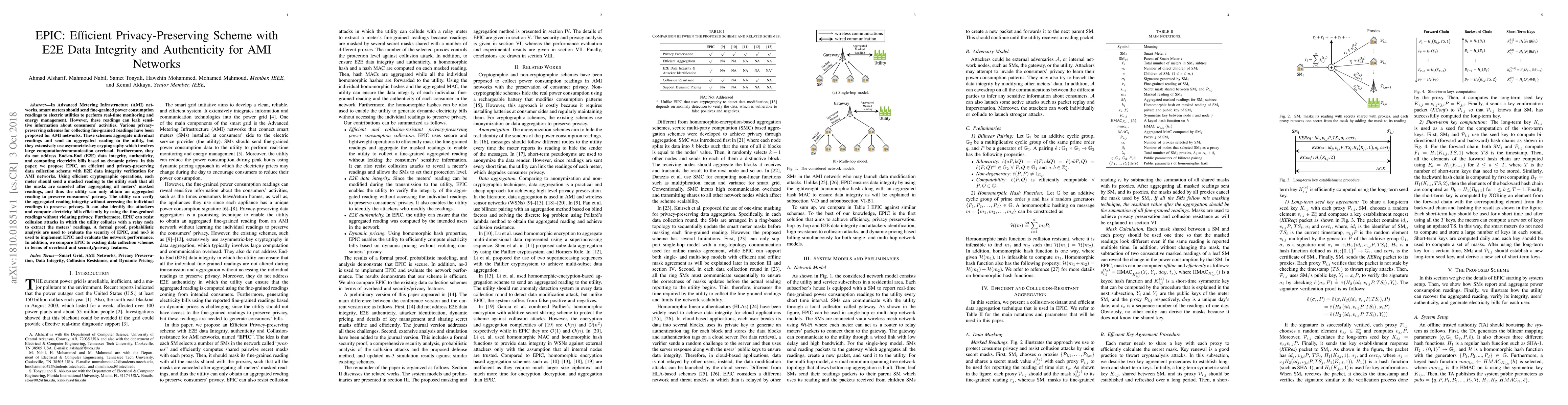 EPIC proposes an efficient privacy-preserving scheme for AMI networks that ensures end-to-end data integrity and authenticity while minimizing computational overhead. It employs masked readings and efficient cryptographic operations to protect consumer privacy and resist collusion attacks.