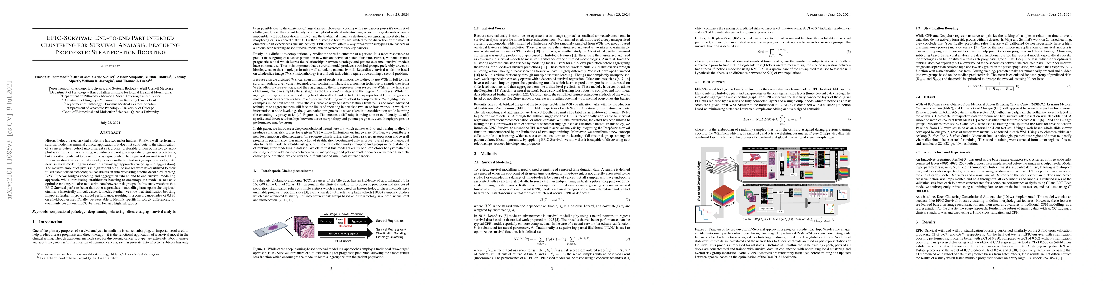 EPIC-Survival integrates end-to-end part inferred clustering for survival analysis, enhancing prognostic stratification boosting. It outperforms traditional methods in modeling intrahepatic cholangiocarcinoma, achieving a concordance-index of 0.880, and identifies distinct histologic differences between risk groups.
