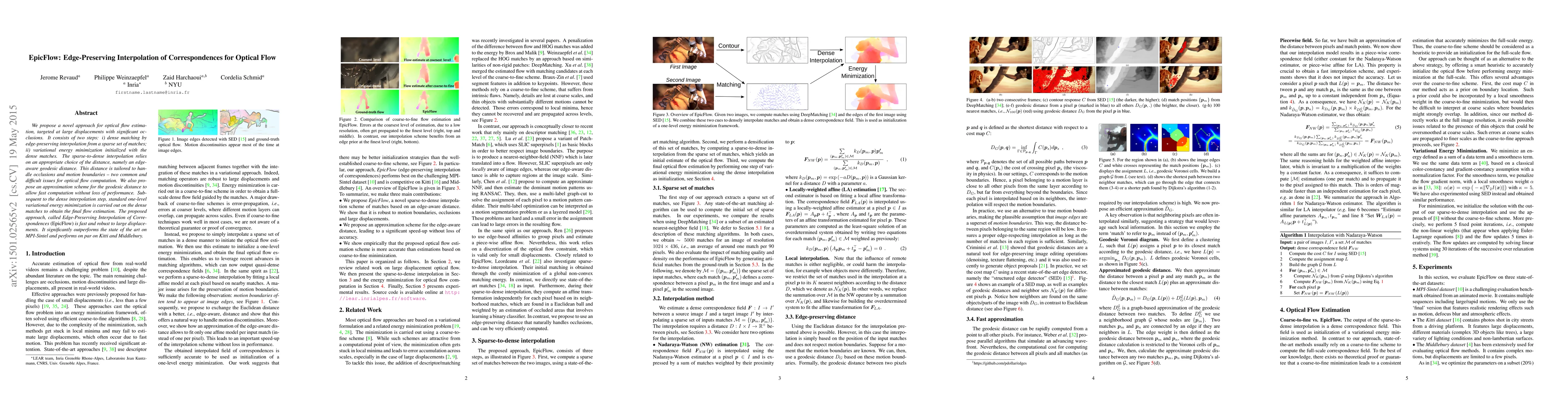 The paper introduces EpicFlow, a novel method for optical flow estimation that handles large displacements and occlusions through edge-preserving interpolation from sparse matches and variational energy minimization. It employs an edge-aware geodesic distance for robust interpolation and outperforms existing methods on benchmark datasets.