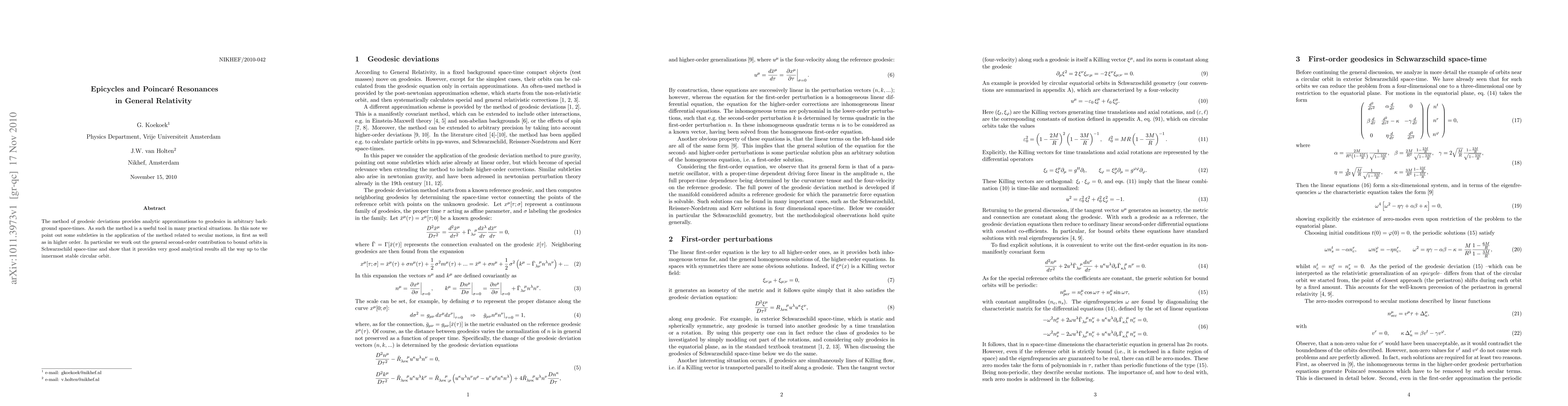 The method of geodesic deviations provides analytic approximations to geodesics in arbitrary background space-times. As such the method is a useful tool in many practical situations. In this note we point out some subtleties in the application of the method related to secular motions, in first as well as in higher order. In particular we work out the general second-order contribution to bound orbits in Schwarzschild space-time and show that it provides very good analytical results all the way up to the innermost stable circular orbit.