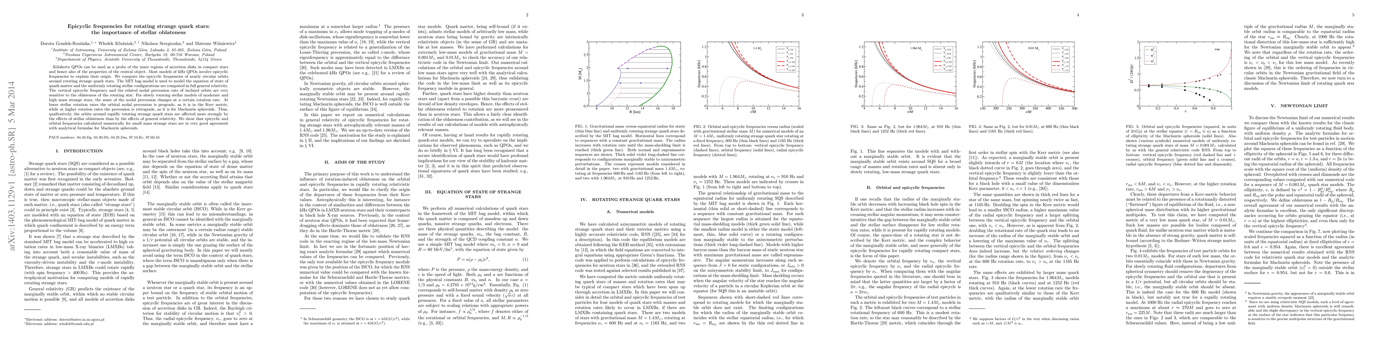This paper investigates the epicyclic frequencies of orbits around rotating strange quark stars, using the MIT bag model and general relativity. It finds that stellar oblateness significantly affects the vertical epicyclic frequency and nodal precession, especially in rapidly rotating stars, where the precession changes from prograde to retrograde.