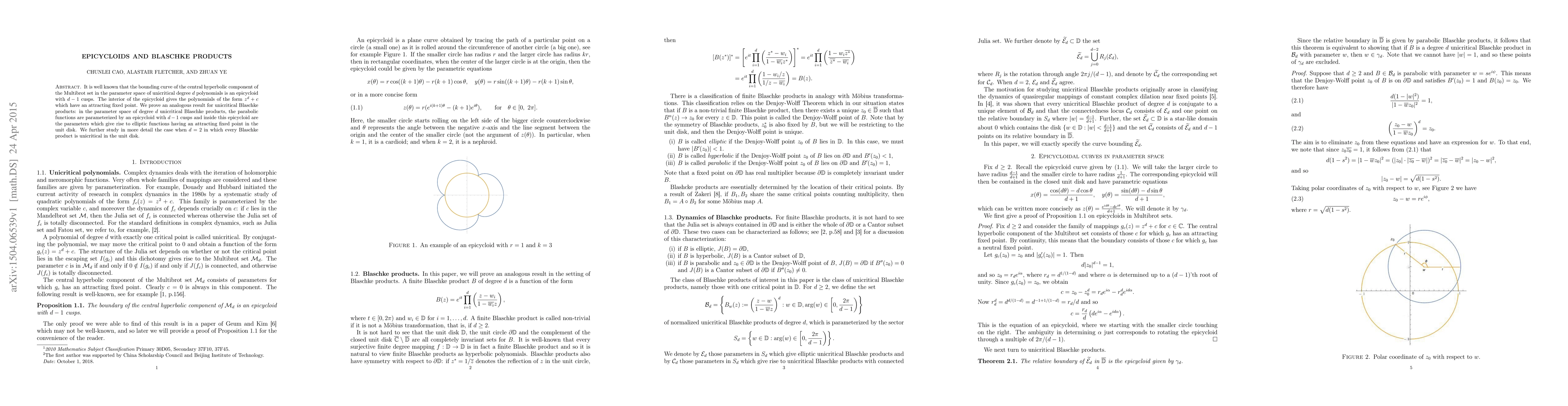 It is well known that the bounding curve of the central hyperbolic component of the Multibrot set in the parameter space of unicritical degree $d$ polynomials is an epicycloid with $d-1$ cusps. The interior of the epicycloid gives the polynomials of the form $z^d+c$ which have an attracting fixed point. We prove an analogous result for unicritical Blaschke products: in the parameter space of degree $d$ unicritical Blaschke products, the parabolic functions are parameterized by an epicycloid with $d-1$ cusps and inside this epicycloid are the parameters which give rise to elliptic functions having an attracting fixed point in the unit disk. We further study in more detail the case when $d=2$ in which every Blaschke product is unicritical in the unit disk.