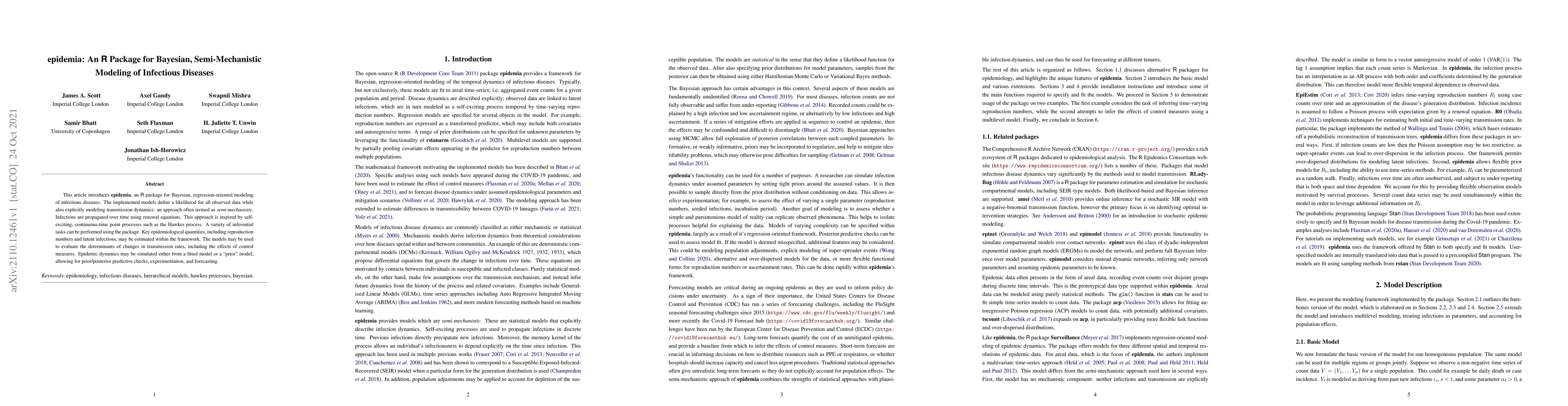 The epidemia R package facilitates semi-mechanistic Bayesian modeling of infectious diseases using point processes, enabling the estimation of key epidemiological metrics and the evaluation of transmission dynamics and control measures. It supports inferential tasks and epidemic simulations for predictive checks and forecasting.
