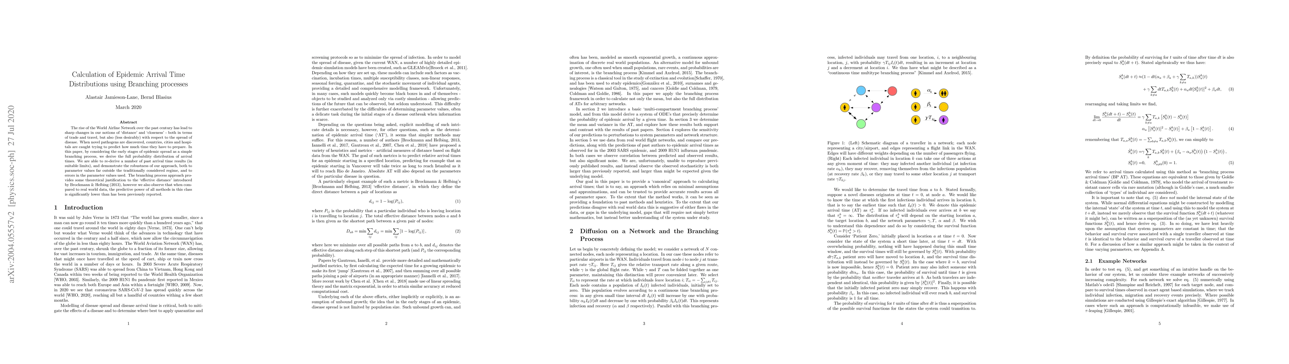The rise of the World Airline Network over the past century has lead to sharp changes in our notions of `distance' and `closeness' - both in terms of trade and travel, but also (less desirably) with respect to the spread of disease. When novel pathogens are discovered, countries, cities and hospitals are caught trying to predict how much time they have to prepare. In this paper, by considering the early stages of epidemic spread as a simple branching process, we derive the full probability distribution of arrival times. We are able to re-derive a number of past arrival time results (in suitable limits), and demonstrate the robustness of our approach, both to parameter values far outside the traditionally considered regime, and to errors in the parameter values used. The branching process approach provides some theoretical justification to the `effective distance' introduced by Brockmann & Helbing (2013), however we also observe that when compared to real world data, the predictive power of all methods in this class is significantly lower than has been previously reported.