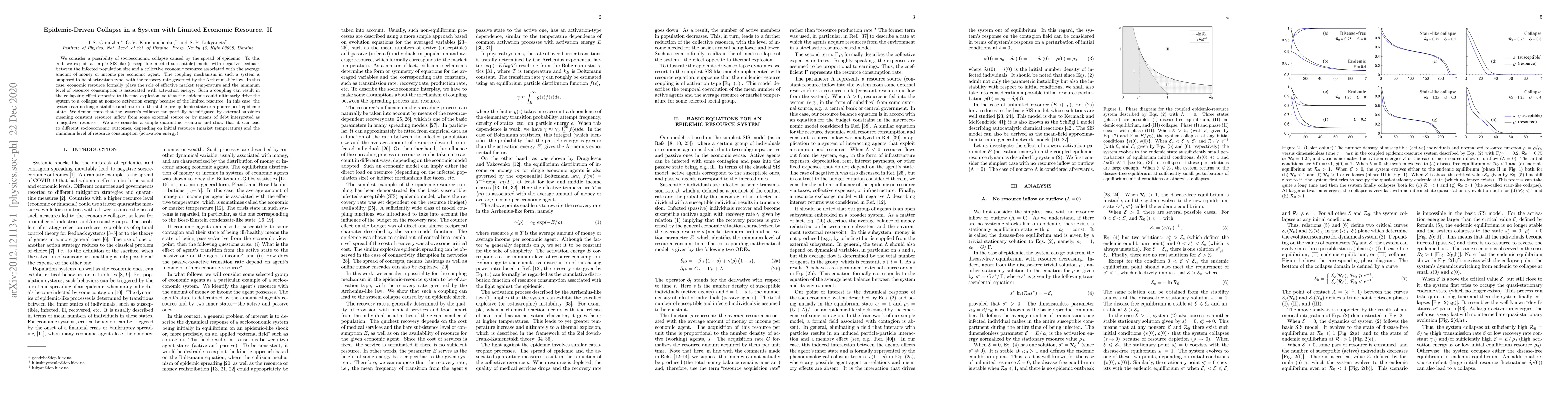 We consider a possibility of socioeconomic collapse caused by the spread of epidemic. To this end, we exploit a simple SIS-like (susceptible-infected-susceptible) model with negative feedback between the infected population size and a collective economic resource associated with the average amount of money or income per economic agent. The coupling mechanism in such a system is supposed to be of activation type, with the recovery rate governed by the Arrhenius-like law. In this case, economic resource formally plays the role of effective market temperature and the minimum level of resource consumption is associated with activation energy. Such a coupling can result in the collapsing effect opposite to thermal explosion, so that the epidemic could ultimately drive the system to a collapse at nonzero activation energy because of the limited resource. In this case, the system can no longer stabilize and return to the stable pre-epidemic state or a poorer post-epidemic state. We demonstrate that the system's collapse can partially be mitigated by external subsidies meaning constant resource inflow from some external source or by means of debt interpreted as a negative resource. We also consider a simple quarantine scenario and show that it can lead to different socioeconomic outcomes, depending on initial resource (market temperature) and the minimum level of resource consumption (activation energy).