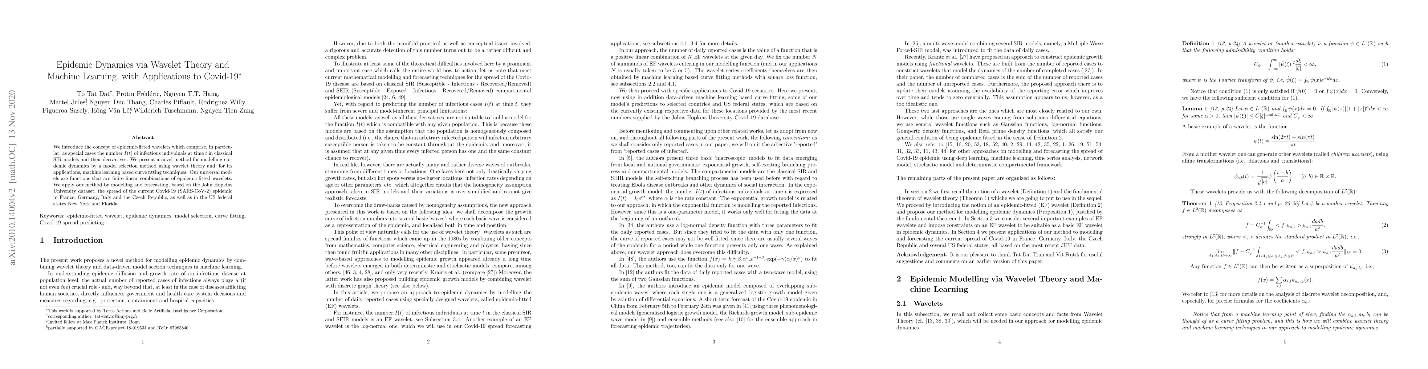 We introduce the concept of epidemic-fitted wavelets which comprise, in particular, as special cases the number $I(t)$ of infectious individuals at time $t$ in classical SIR models and their derivatives. We present a novel method for modelling epidemic dynamics by a model selection method using wavelet theory and, for its applications, machine learning based curve fitting techniques. Our universal models are functions that are finite linear combinations of epidemic-fitted wavelets. We apply our method by modelling and forecasting, based on the John Hopkins University dataset, the spread of the current Covid-19 (SARS-CoV-2) epidemic in France, Germany, Italy and the Czech Republic, as well as in the US federal states New York and Florida.