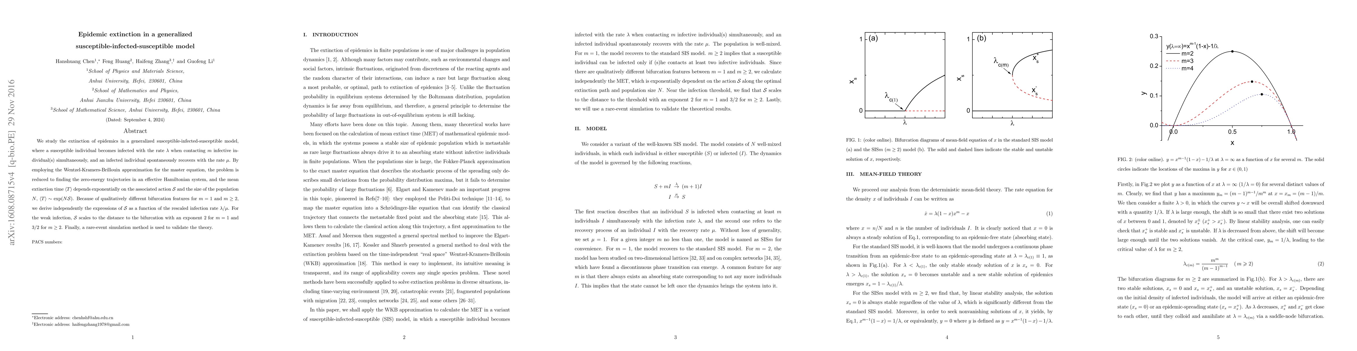 We study the extinction of epidemics in a generalized susceptible-infected-susceptible model, where a susceptible individual becomes infected with the rate $\lambda$ when contacting $m$ infective individual(s) simultaneously, and an infected individual spontaneously recovers with the rate $\mu$. By employing the Wentzel-Kramers-Brillouin approximation for the master equation, the problem is reduced to finding the zero-energy trajectories in an effective Hamiltonian system, and the mean extinction time $\langle T\rangle$ depends exponentially on the associated action $\mathcal {S}$ and the size of the population $N$, $\langle T\rangle \sim \exp(N\mathcal {S})$. Because of qualitatively different bifurcation features for $m=1$ and $m\geq2$, we derive independently the expressions of $\mathcal {S}$ as a function of the rescaled infection rate $\lambda/\mu$. For the weak infection, $\mathcal {S}$ scales to the distance to the bifurcation with an exponent $2$ for $m=1$ and $3/2$ for $m\geq2$. Finally, a rare-event simulation method is used to validate the theory.