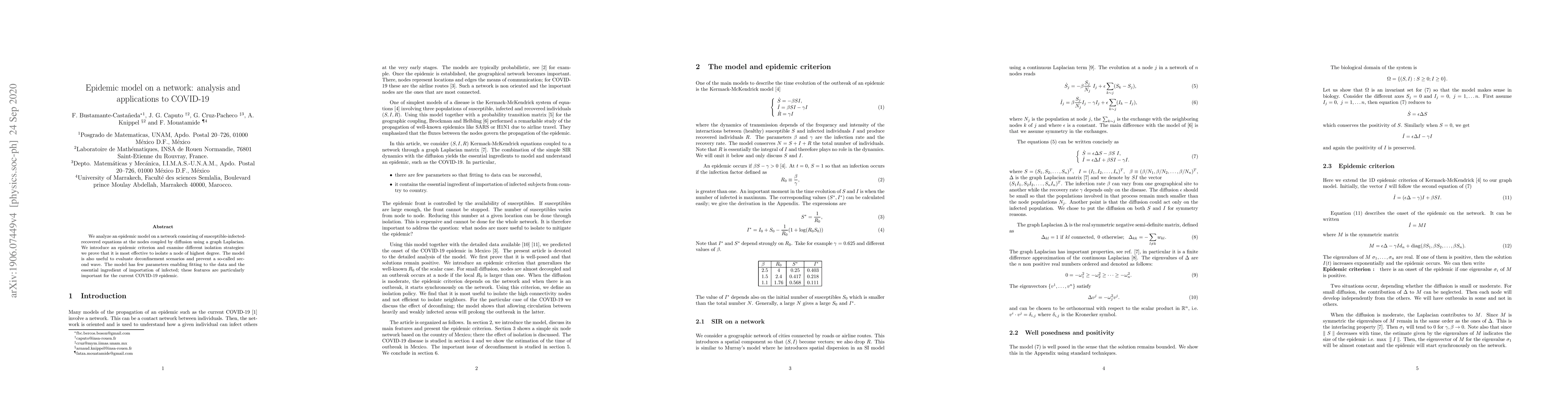 We analyze an epidemic model on a network consisting of susceptible-infected-recovered equations at the nodes coupled by diffusion using a graph Laplacian. We introduce an epidemic criterion and examine different vaccination/containment strategies: we prove that it is most effective to vaccinate a node of highest degree. The model is also useful to evaluate deconfinement scenarios and prevent a so-called second wave. The model has few parameters enabling fitting to the data and the essential ingredient of importation of infected; these features are particularly important for the current COVID-19 epidemic.