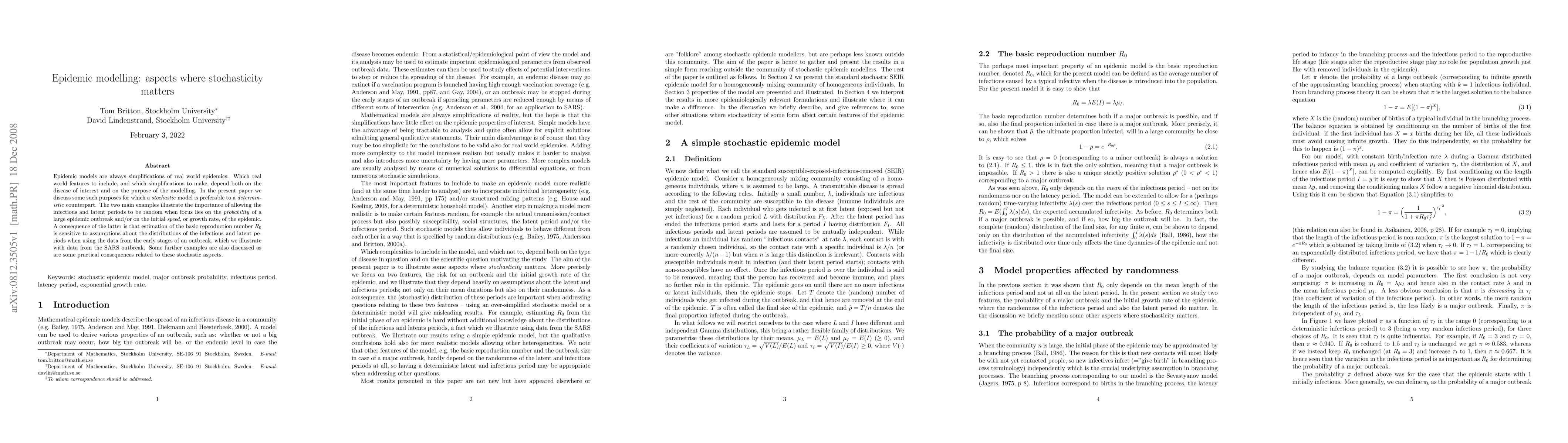 Epidemic models are always simplifications of real world epidemics. Which real world features to include, and which simplifications to make, depend both on the disease of interest and on the purpose of the modelling. In the present paper we discuss some such purposes for which a \emph{stochastic} model is preferable to a \emph{deterministic} counterpart. The two main examples illustrate the importance of allowing the infectious and latent periods to be random when focus lies on the \emph{probability} of a large epidemic outbreak and/or on the initial \emph{speed}, or growth rate, of the epidemic. A consequence of the latter is that estimation of the basic reproduction number $R_0$ is sensitive to assumptions about the distributions of the infectious and latent periods when using the data from the early stages of an outbreak, which we illustrate with data from the SARS outbreak. Some further examples are also discussed as are some practical consequences related to these stochastic aspects.