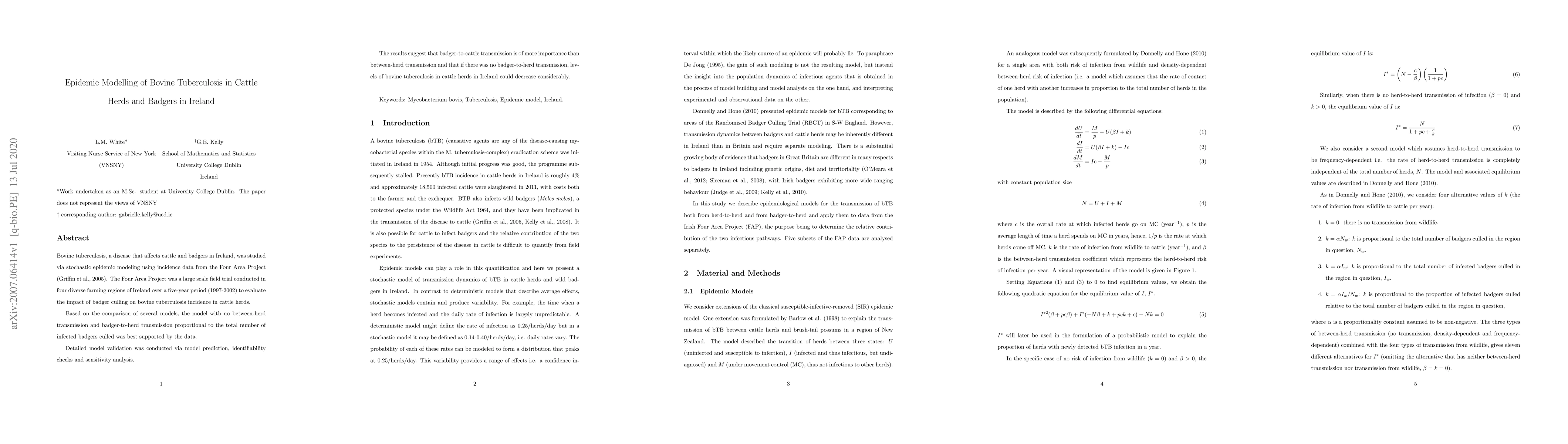 This study uses stochastic epidemic modeling to analyze bovine tuberculosis in Ireland, finding badger-to-cattle transmission to be more significant than between-herd transmission. The best-supported model indicates that reducing badger-to-herd transmission could significantly lower tuberculosis levels in cattle herds.
