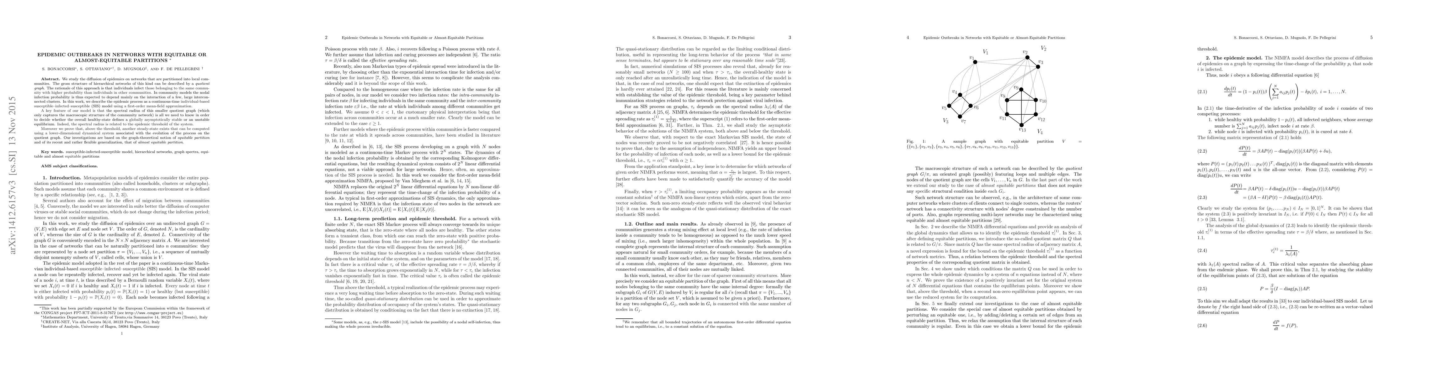 We study the diffusion of epidemics on networks that are partitioned into local communities. The gross structure of hierarchical networks of this kind can be described by a quotient graph. The rationale of this approach is that individuals infect those belonging to the same community with higher probability than individuals in other communities. In community models the nodal infection probability is thus expected to depend mainly on the interaction of a few, large interconnected clusters. In this work, we describe the epidemic process as a continuous-time individual-based susceptible-infected-susceptible (SIS) model using a first-order mean-field approximation. A key feature of our model is that the spectral radius of this smaller quotient graph (which only captures the macroscopic structure of the community network) is all we need to know in order to decide whether the overall healthy-state defines a globally asymptotically stable or an unstable equilibrium. Indeed, the spectral radius is related to the epidemic threshold of the system. Moreover we prove that, above the threshold, another steady-state exists that can be computed using a lower-dimensional dynamical system associated with the evolution of the process on the quotient graph. Our investigations are based on the graph-theoretical notion of equitable partition and of its recent and rather flexible generalization, that of almost equitable partition.