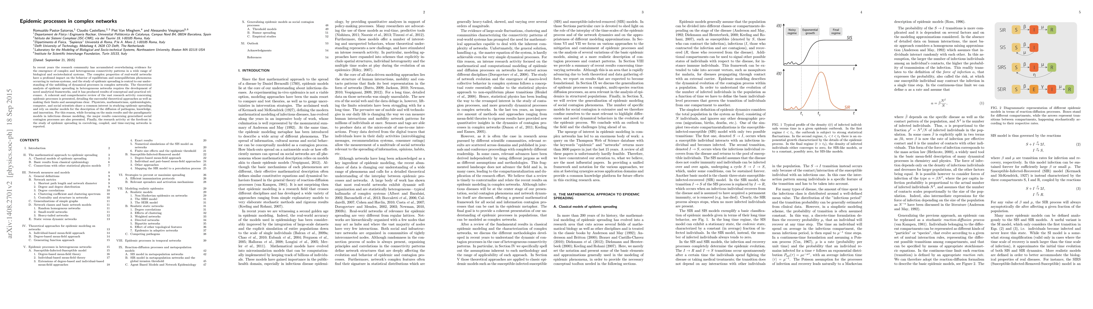 This paper reviews theoretical approaches for analyzing epidemic spreading in complex, heterogeneous networks, emphasizing the impact of network structure on dynamical processes. It highlights the common models used across various disciplines and discusses emerging research on evolving and coupled networks.