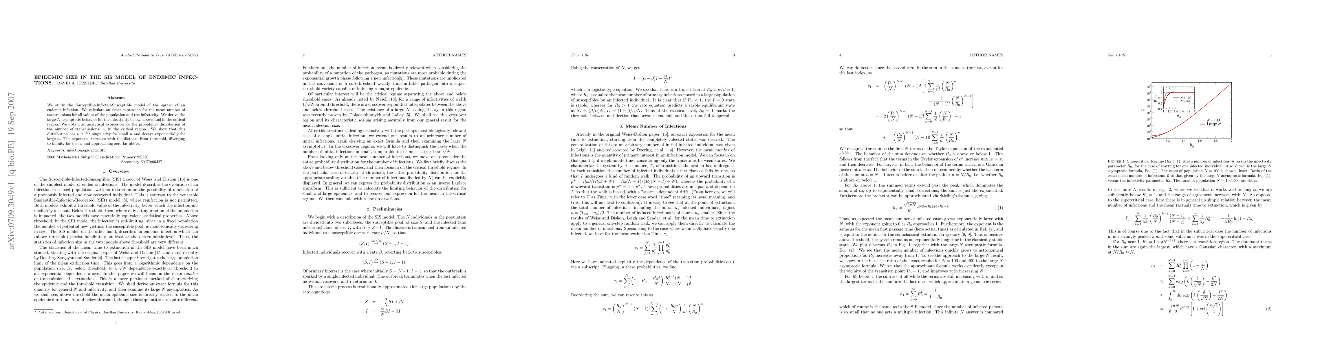 We study the Susceptible-Infected-Susceptible model of the spread of an endemic infection. We calculate an exact expression for the mean number of transmissions for all values of the population and the infectivity. We derive the large-N asymptotic behavior for the infectivitiy below, above, and in the critical region. We obtain an analytical expression for the probability distribution of the number of transmissions, n, in the critical region. We show that this distribution has a $n^3/2$ singularity for small n and decays exponentially for large n. The exponent decreases with the distance from threshold, diverging to infinity far below and approaching zero far above.