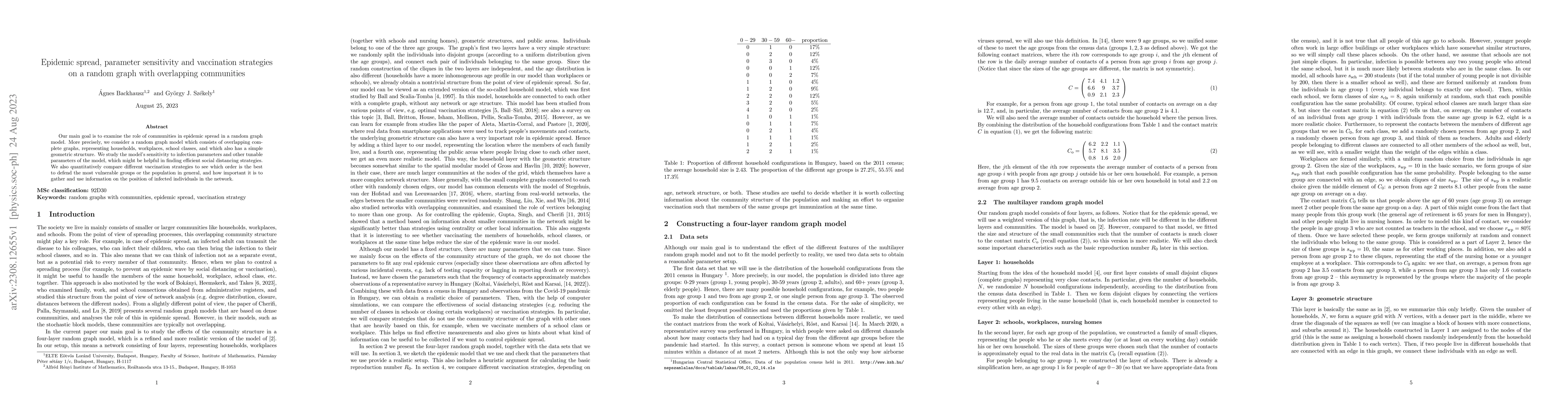 Our main goal is to examine the role of communities in epidemic spread in a random graph model. More precisely, we consider a random graph model which consists of overlapping complete graphs, representing households, workplaces, school classes, and which also has a simple geometric structure. We study the model's sensitivity to infection parameters and other tunable parameters of the model, which might be helpful in finding efficient social distancing strategies. We also quantitatively compare different vaccination strategies to see which order is the best to defend the most vulnerable groups or the population in general, and how important it is to gather and use information on the position of infected individuals in the network.