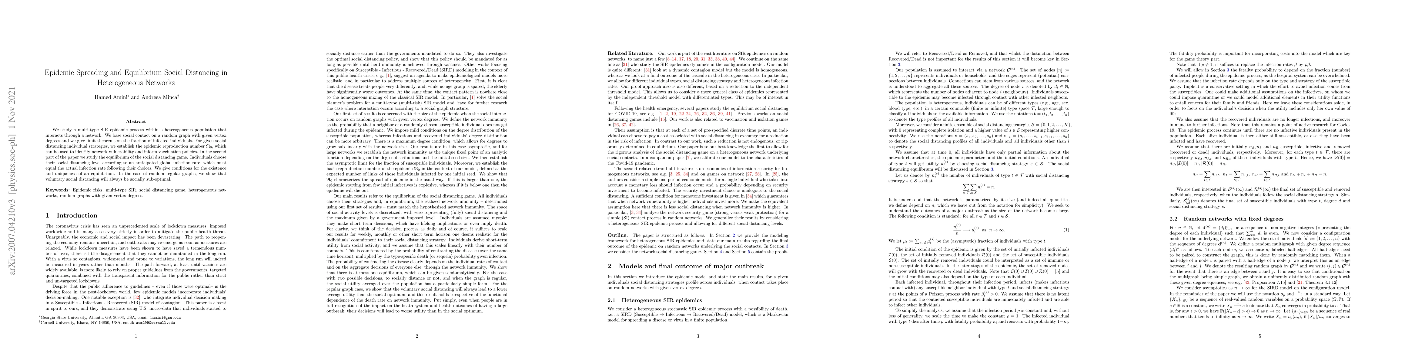 This paper investigates a multi-type SIR epidemic model in heterogeneous networks, deriving limit theorems for infection fractions and the epidemic reproduction number $R_0$ to assess network vulnerability. It also explores the equilibrium of social distancing strategies, finding that voluntary social distancing is socially sub-optimal in random regular graphs.