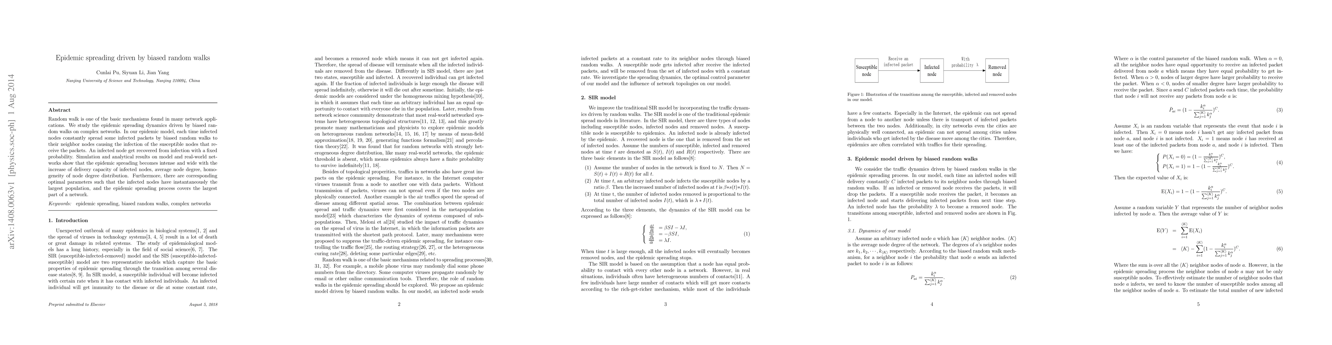 This paper investigates epidemic spreading dynamics on complex networks driven by biased random walks, where infected nodes spread packets to neighbors, causing susceptible nodes to become infected. The study finds that increased delivery capacity, higher average node degree, and greater homogeneity in degree distribution intensify the spread, with specific optimal parameters leading to the largest infected population and extensive network coverage.
