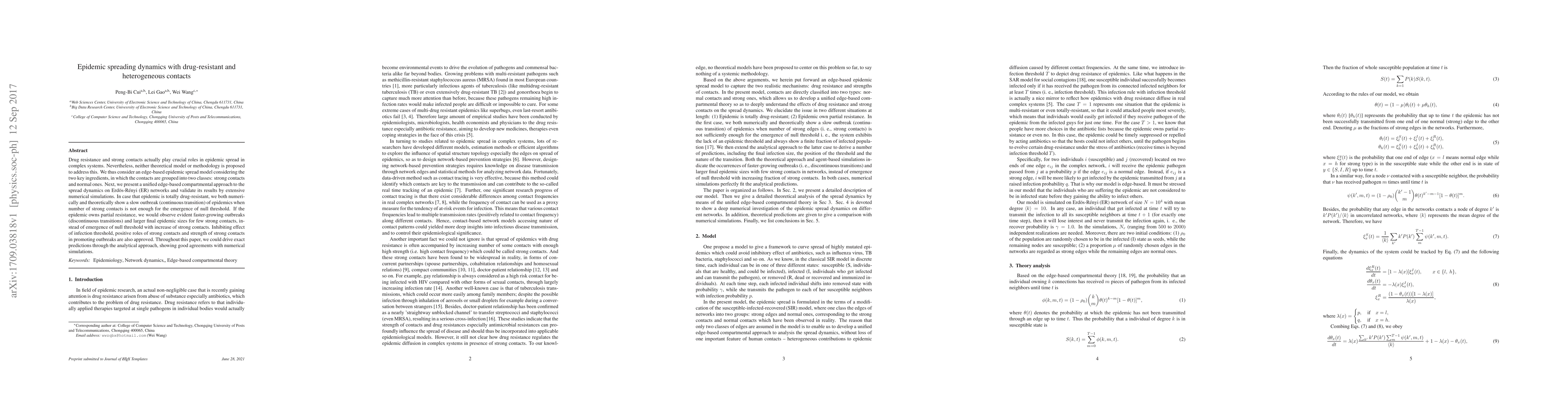 Drug resistance and strong contacts actually play crucial roles in epidemic spread in complex systems. Nevertheless, neither theoretical model or methodology is proposed to address this. We thus consider an edge-based epidemic spread model considering the two key ingredients, in which the contacts are grouped into two classes: strong contacts and normal ones. Next, we present a unified edge-based compartmental approach to the spread dynamics on Erd\"{o}s-R\'{e}nyi (ER) networks and validate its results by extensive numerical simulations. In case that epidemic is totally drug-resistant, we both numerically and theoretically show a slow outbreak (continuous transition) of epidemics when number of strong contacts is not enough for the emergence of null threshold. If the epidemic owns partial resistance, we would observe evident faster-growing outbreaks (discontinuous transitions) and larger final epidemic sizes for few strong contacts, instead of emergence of null threshold with increase of strong contacts. Inhibiting effect of infection threshold, positive roles of strong contacts and strength of strong contacts in promoting outbreaks are also approved. Throughout this paper, we could drive exact predictions through the analytical approach, showing good agreements with numerical simulations.