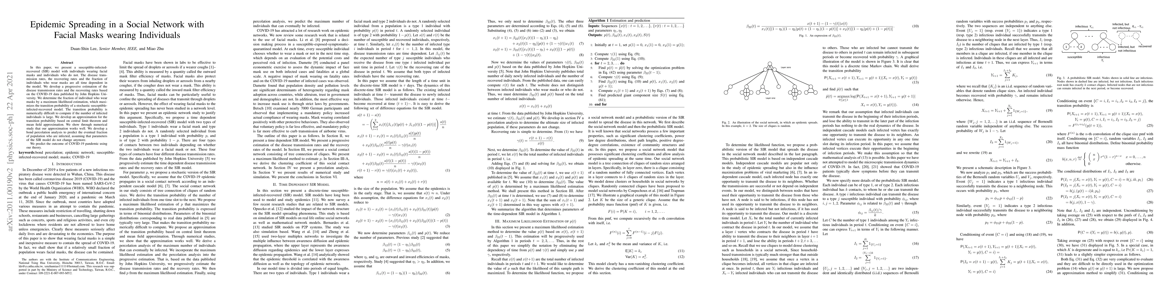 This paper models epidemic spreading in a social network with facial mask-wearing individuals, using a SIR model with time-dependent disease transmission rates, recovering rates, and mask-wearing fractions to predict the eventual fraction of population infected during the COVID-19 pandemic.