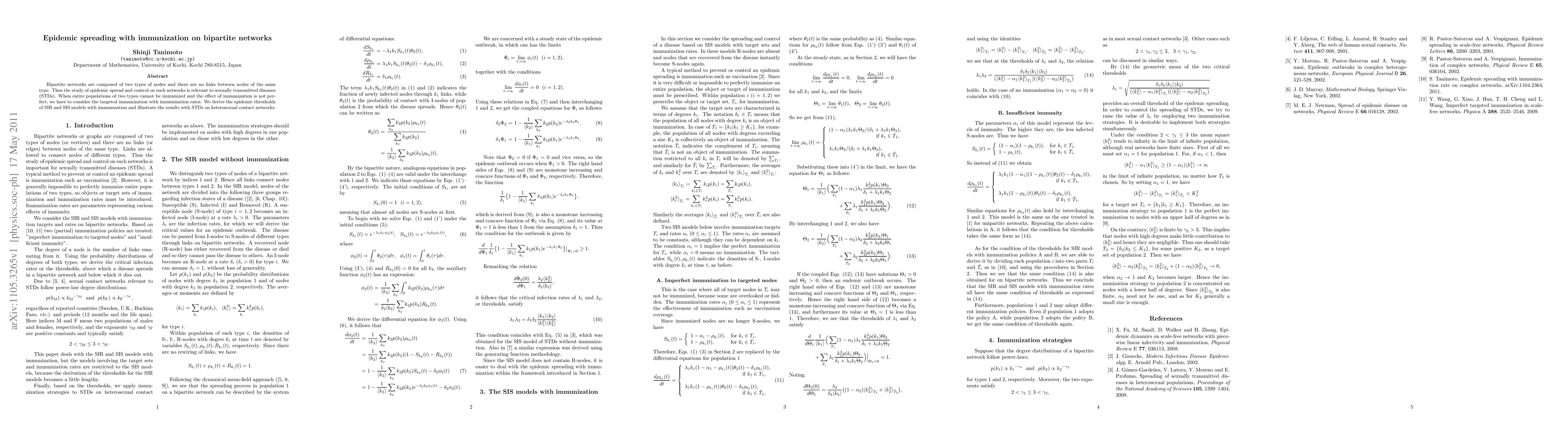 This paper examines epidemic spreading and control on bipartite networks, focusing on sexually transmitted diseases within heterosexual contact networks. It derives epidemic thresholds for SIR and SIS models with targeted immunization strategies, accounting for imperfect immunization rates.