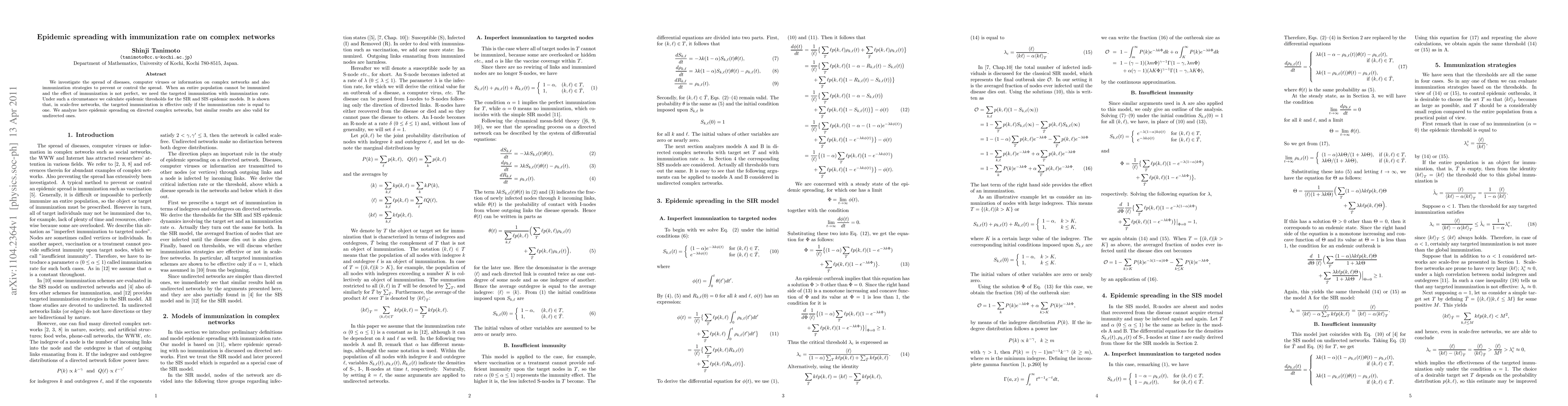This paper examines the spread of epidemics, computer viruses, and information on complex networks, focusing on immunization strategies under partial coverage and imperfect effects. It determines epidemic thresholds for SIR and SIS models and concludes that targeted immunization is only effective in scale-free networks when the immunization rate equals one. The analysis applies to both directed and undirected networks.