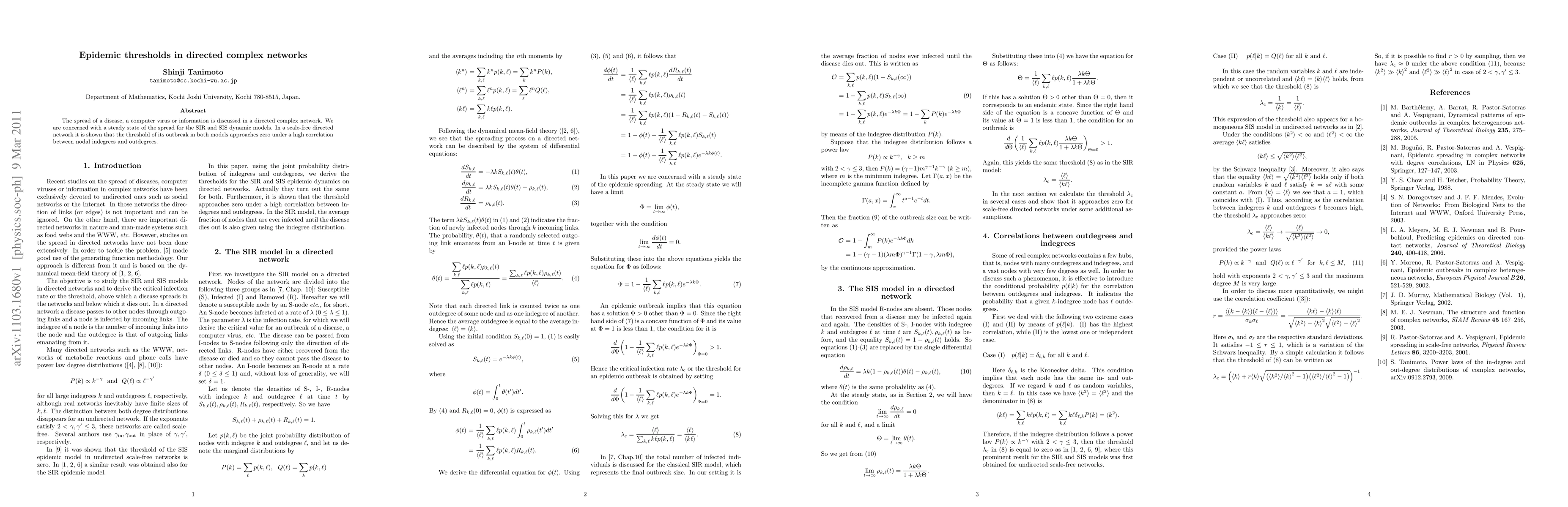 The spread of a disease, a computer virus or information is discussed in a directed complex network. We are concerned with a steady state of the spread for the SIR and SIS dynamic models. In a scale-free directed network it is shown that the threshold of its outbreak in both models approaches zero under a high correlation between nodal indegrees and outdegrees.