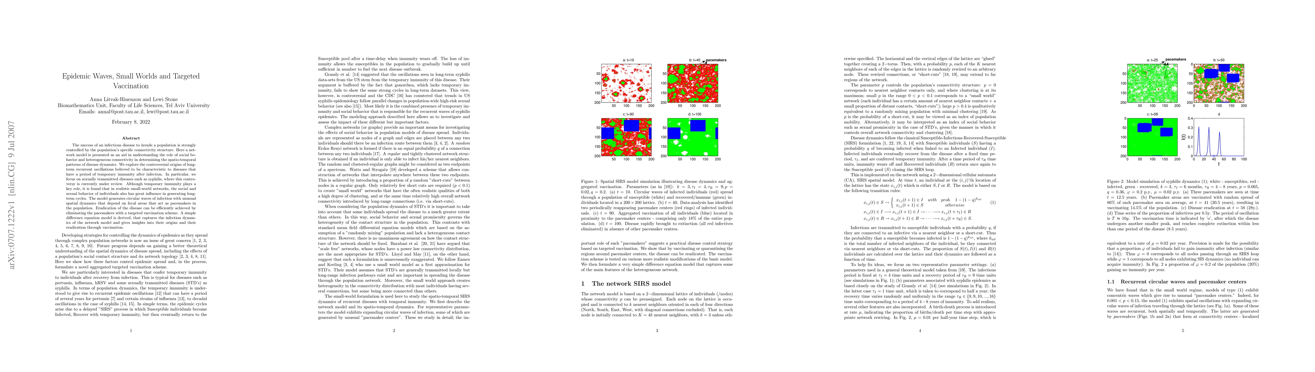 The success of an infectious disease to invade a population is strongly controlled by the population's specific connectivity structure. Here a network model is presented as an aid in understanding the role of social behavior and heterogeneous connectivity in determining the spatio-temporal patterns of disease dynamics. We explore the controversial origins of long-term recurrent oscillations believed to be characteristic to diseases that have a period of temporary immunity after infection. In particular, we focus on sexually transmitted diseases such as syphilis, where this controversy is currently under review. Although temporary immunity plays a key role, it is found that in realistic small-world networks, the social and sexual behavior of individuals also has great influence in generating long-term cycles. The model generates circular waves of infection with unusual spatial dynamics that depend on focal areas that act as pacemakers in the population. Eradication of the disease can be efficiently achieved by eliminating the pacemakers with a targeted vaccination scheme. A simple difference equation model is derived, that captures the infection dynamics of the network model and gives insights into their origins and their eradication through vaccination.