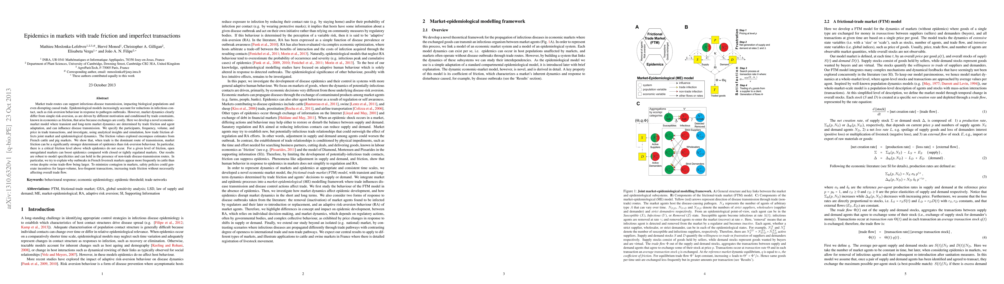 Market trade-routes can support infectious-disease transmission, impacting biological populations and even disrupting causal trade. Epidemiological models increasingly account for reductions in infectious contact, such as risk-aversion behaviour in response to pathogen outbreaks. However, market dynamics clearly differ from simple risk-aversion, as are driven by different motivation and conditioned by trade constraints, known in economics as friction, that arise because exchanges are costly. Here we develop a novel economic-market model where transient and long-term market dynamics are determined by trade friction and agent adaptation, and can influence disease transmission. We specify the participants, frequency, volume, and price in trade transactions, and investigate, using analytical insights and simulation, how trade friction affects joint market and epidemiological dynamics. The friction values explored encompass estimates from French cattle and pig markets. We show that, when trade is the dominant route of transmission, market friction can be a significantly stronger determinant of epidemics than risk-aversion behaviour. In particular, there is a critical friction level above which epidemics do not occur. For a given level of friction, open unregulated markets can boost epidemics compared with closed or tightly regulated markets. Our results are robust to model specificities and can hold in the presence of non-trade disease-transmission routes. In particular, we try to explain why outbreaks in French livestock markets appear more frequently in cattle than swine despite swine trade-flow being larger. To minimize contagion in markets, safety policies could generate incentives for larger-volume, less-frequent transactions, increasing trade friction without necessarily affecting overall trade flow.