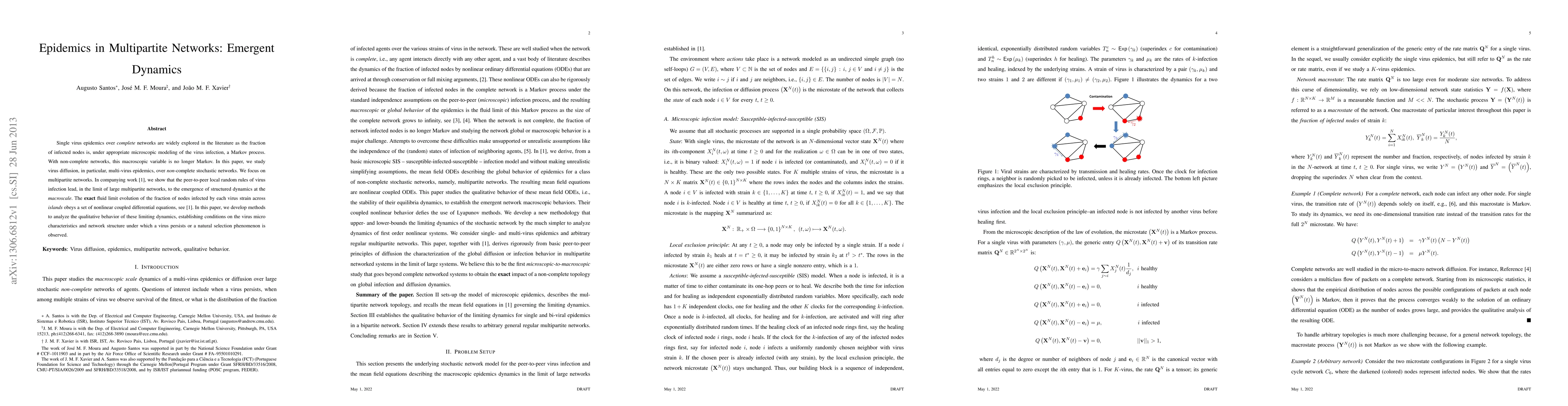 Single virus epidemics over complete networks are widely explored in the literature as the fraction of infected nodes is, under appropriate microscopic modeling of the virus infection, a Markov process. With non-complete networks, this macroscopic variable is no longer Markov. In this paper, we study virus diffusion, in particular, multi-virus epidemics, over non-complete stochastic networks. We focus on multipartite networks. In companying work http://arxiv.org/abs/1306.6198, we show that the peer-to-peer local random rules of virus infection lead, in the limit of large multipartite networks, to the emergence of structured dynamics at the macroscale. The exact fluid limit evolution of the fraction of nodes infected by each virus strain across islands obeys a set of nonlinear coupled differential equations, see http://arxiv.org/abs/1306.6198. In this paper, we develop methods to analyze the qualitative behavior of these limiting dynamics, establishing conditions on the virus micro characteristics and network structure under which a virus persists or a natural selection phenomenon is observed.
