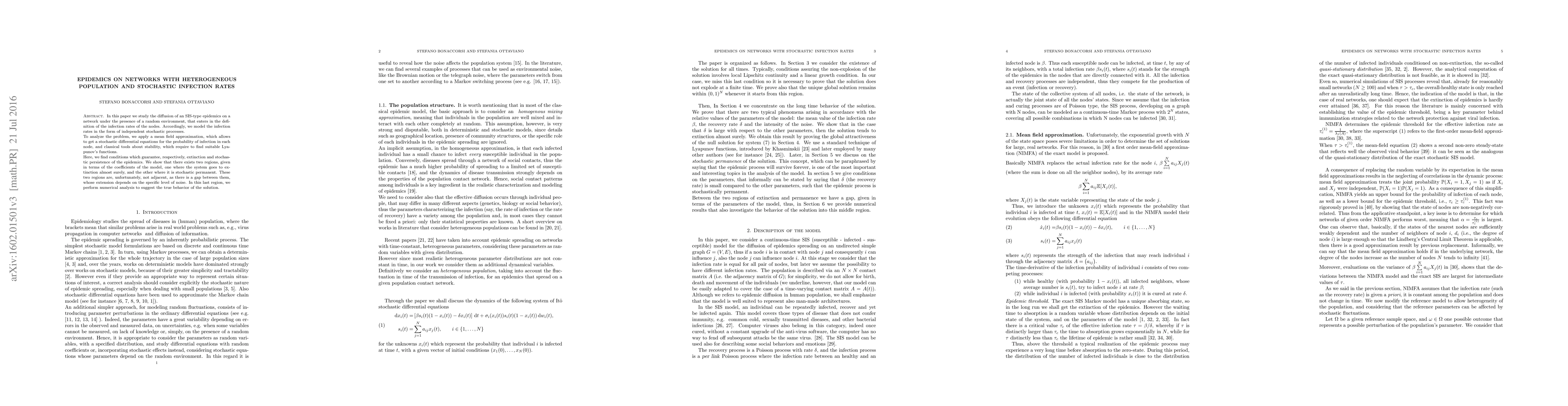 In this paper we study the diffusion of an SIS-type epidemics on a network under the presence of a random environment, that enters in the definition of the infection rates of the nodes. Accordingly, we model the infection rates in the form of independent stochastic processes. To analyze the problem, we apply a mean field approximation, which allows to get a stochastic differential equations for the probability of infection in each node, and classical tools about stability, which require to find suitable Lyapunov's functions. Here, we find conditions which guarantee, respectively, extinction and stochastic persistence of the epidemics. We show that there exists two regions, given in terms of the coefficients of the model, one where the system goes to extinction almost surely, and the other where it is stochastic permanent. These two regions are, unfortunately, not adjacent, as there is a gap between them, whose extension depends on the specific level of noise. In this last region, we perform numerical analysis to suggest the true behavior of the solution.