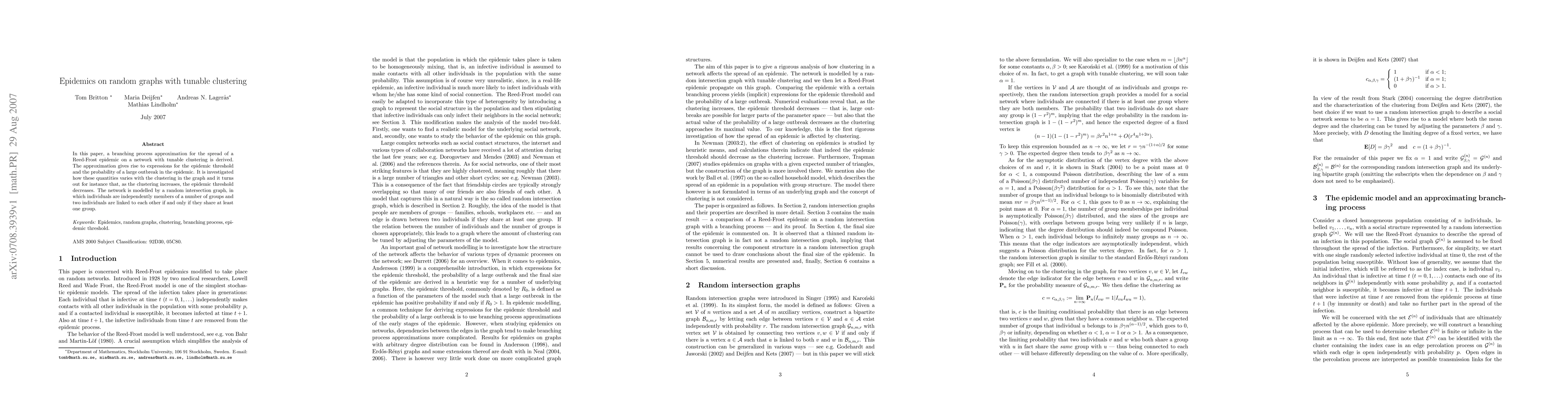 This paper derives a branching process approximation for a Reed-Frost epidemic on a random intersection graph with tunable clustering, revealing that increased clustering lowers the epidemic threshold and affects outbreak probabilities. The model captures how network structure influences disease spread.