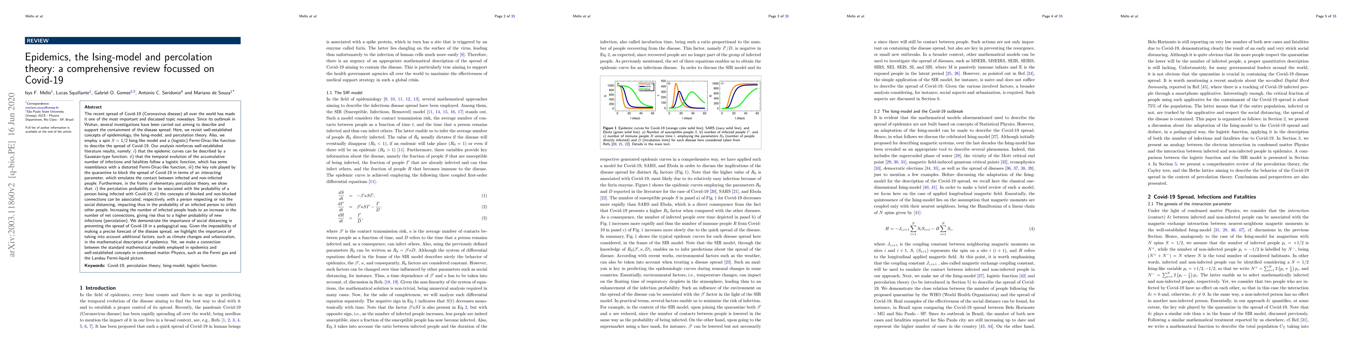We revisit well-established concepts of epidemiology, the Ising-model, and percolation theory. Also, we employ a spin $S$ = 1/2 Ising-like model and a (logistic) Fermi-Dirac-like function to describe the spread of Covid-19. Our analysis reinforces well-established literature results, namely: \emph{i}) that the epidemic curves can be described by a Gaussian-type function; \emph{ii}) that the temporal evolution of the accumulative number of infections and fatalities follow a logistic function, which has some resemblance with a distorted Fermi-Dirac-like function; \emph{iii}) the key role played by the quarantine to block the spread of Covid-19 in terms of an \emph{interacting} parameter, which emulates the contact between infected and non-infected people. Furthermore, in the frame of elementary percolation theory, we show that: \emph{i}) the percolation probability can be associated with the probability of a person being infected with Covid-19; \emph{ii}) the concepts of blocked and non-blocked connections can be associated, respectively, with a person respecting or not the social distancing, impacting thus in the probability of an infected person to infect other people. Increasing the number of infected people leads to an increase in the number of net connections, giving rise thus to a higher probability of new infections (percolation). We demonstrate the importance of social distancing in preventing the spread of Covid-19 in a pedagogical way. Given the impossibility of making a precise forecast of the disease spread, we highlight the importance of taking into account additional factors, such as climate changes and urbanization, in the mathematical description of epidemics. Yet, we make a connection between the standard mathematical models employed in epidemics and well-established concepts in condensed matter Physics, such as the Fermi gas and the Landau Fermi-liquid picture.