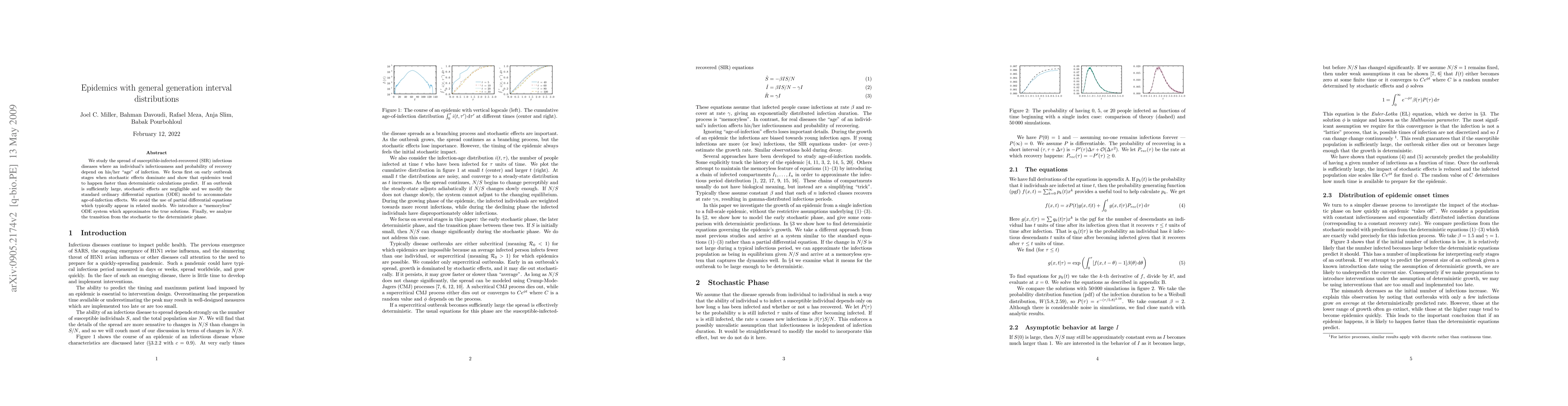 We study the spread of susceptible-infected-recovered (SIR) infectious diseases where an individual's infectiousness and probability of recovery depend on his/her "age" of infection. We focus first on early outbreak stages when stochastic effects dominate and show that epidemics tend to happen faster than deterministic calculations predict. If an outbreak is sufficiently large, stochastic effects are negligible and we modify the standard ordinary differential equation (ODE) model to accommodate age-of-infection effects. We avoid the use of partial differential equations which typically appear in related models. We introduce a "memoryless" ODE system which approximates the true solutions. Finally, we analyze the transition from the stochastic to the deterministic phase.