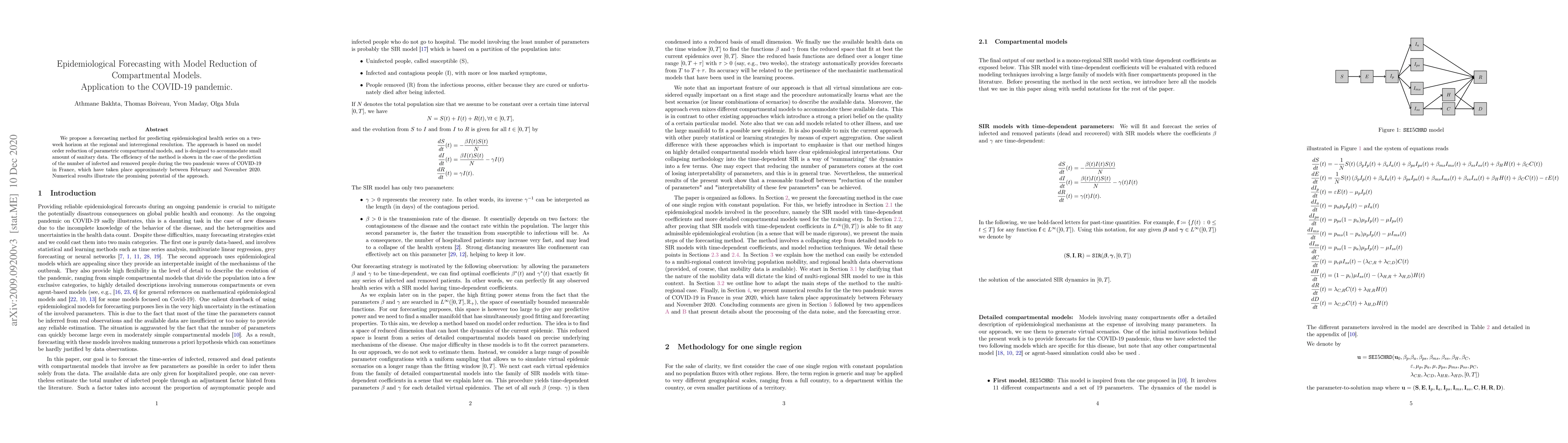 This paper introduces a forecasting method based on model order reduction of compartmental models to predict epidemiological data over a two-week horizon. The method effectively utilizes limited sanitary data and demonstrates its potential in forecasting COVID-19 infection and removal trends in France during the first two pandemic waves.