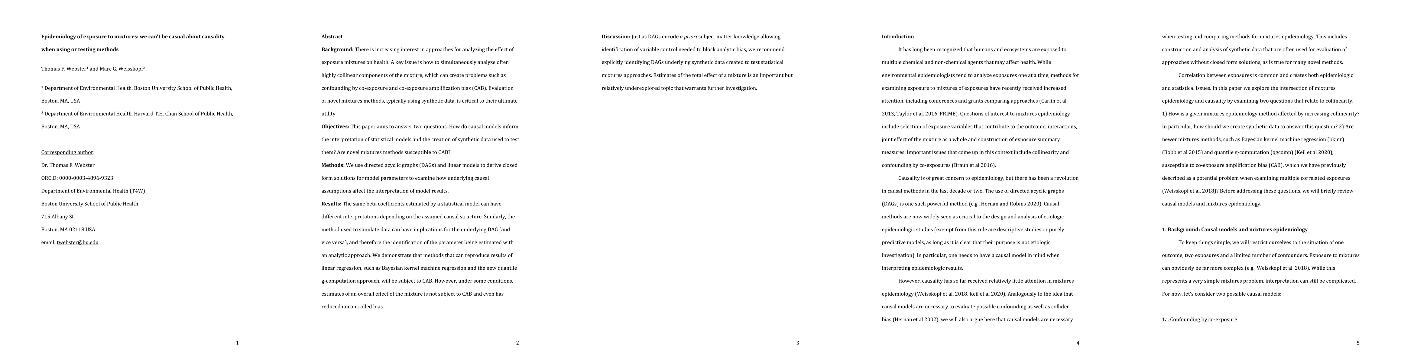 Background: There is increasing interest in approaches for analyzing the effect of exposure mixtures on health. A key issue is how to simultaneously analyze often highly collinear components of the mixture, which can create problems such as confounding by co-exposure and co-exposure amplification bias (CAB). Evaluation of novel mixtures methods, typically using synthetic data, is critical to their ultimate utility. Objectives: This paper aims to answer two questions. How do causal models inform the interpretation of statistical models and the creation of synthetic data used to test them? Are novel mixtures methods susceptible to CAB? Methods: We use directed acyclic graphs (DAGs) and linear models to derive closed form solutions for model parameters to examine how underlying causal assumptions affect the interpretation of model results. Results: The same beta coefficients estimated by a statistical model can have different interpretations depending on the assumed causal structure. Similarly, the method used to simulate data can have implications for the underlying DAG (and vice versa), and therefore the identification of the parameter being estimated with an analytic approach. We demonstrate that methods that can reproduce results of linear regression, such as Bayesian kernel machine regression and the new quantile g-computation approach, will be subject to CAB. However, under some conditions, estimates of an overall effect of the mixture is not subject to CAB and even has reduced uncontrolled bias. Discussion: Just as DAGs encode a priori subject matter knowledge allowing identification of variable control needed to block analytic bias, we recommend explicitly identifying DAGs underlying synthetic data created to test statistical mixtures approaches. Estimates of the total effect of a mixture is an important but relatively underexplored topic that warrants further investigation.