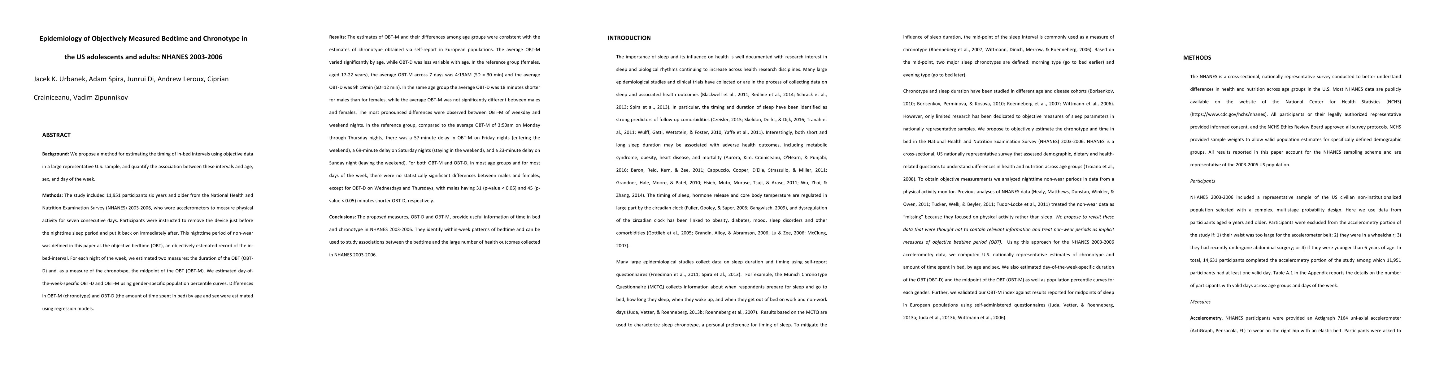 This study used objective data from accelerometers in U.S. adolescents and adults (NHANES 2003-2006) to estimate bedtime (OBT) and chronotype, finding significant age and day-of-week variations. OBT-M (chronotype) and OBT-D (time spent in bed) varied with age, with more pronounced weekday-versus-weekend differences, providing insights into health outcome associations.