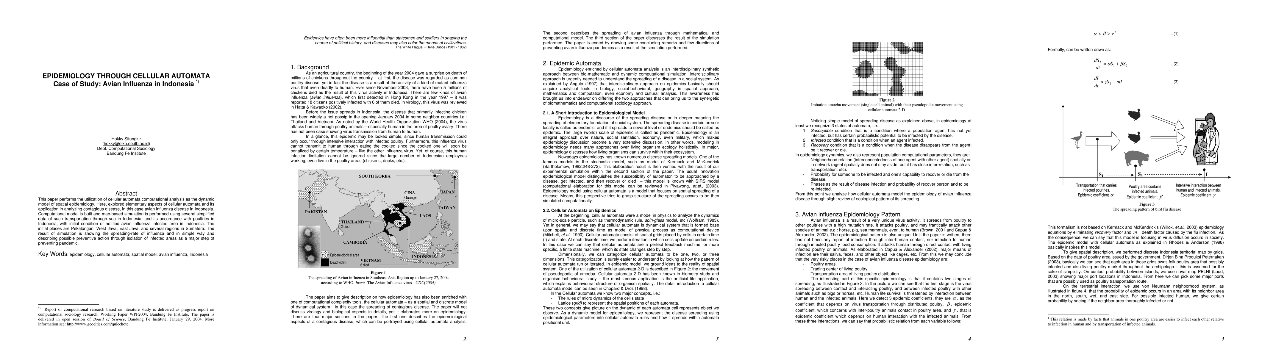 This paper performs the utilization of cellular automata computational analysis as the dynamic model of spatial epidemiology. Here, explored elementary aspects of cellular automata and its application in analyzing contagious disease, in this case avian influenza disease in Indonesia. Computational model is built and map-based simulation is performed using several simplified data of such transportation through sea in Indonesia, and its accordance with poultries in Indonesia, with initial condition of notified avian influenza infected area in Indonesia. The initial places are Pekalongan, West Java, East Java, and several regions in Sumatera. The result of simulation is showing the spreading-rate of influenza and in simple way and describing possible preventive action through isolation of infected areas as a major step of preventing pandemic.