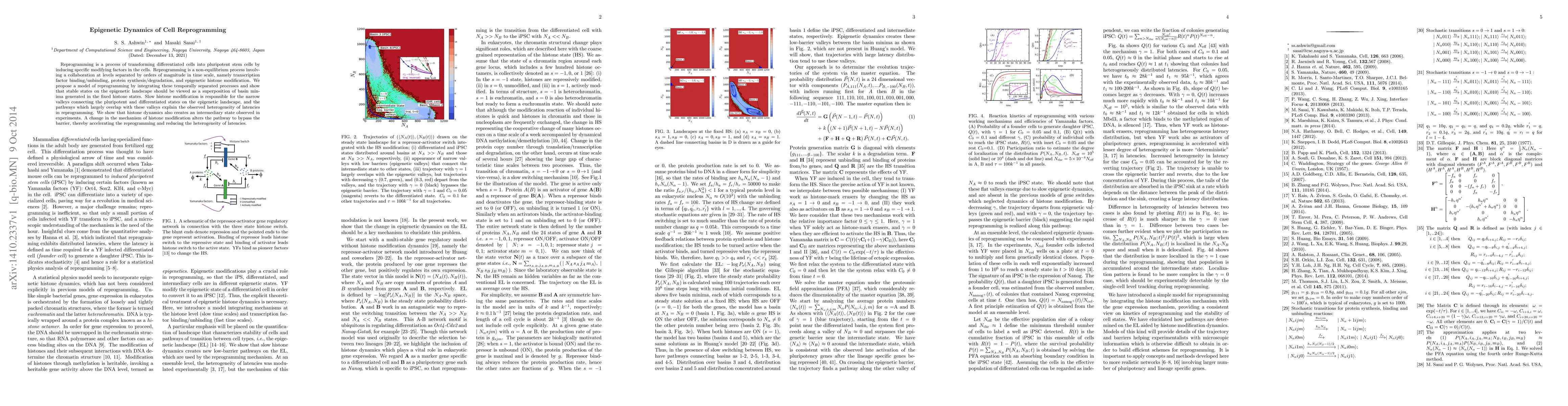 This paper proposes a model integrating various temporally separated processes in cell reprogramming, showing that stable states on the epigenetic landscape are superpositions of basin minima. It highlights how slow histone modification creates narrow valleys connecting pluripotent and differentiated states, explaining observed latency heterogeneity and the intermediary state in reprogramming.