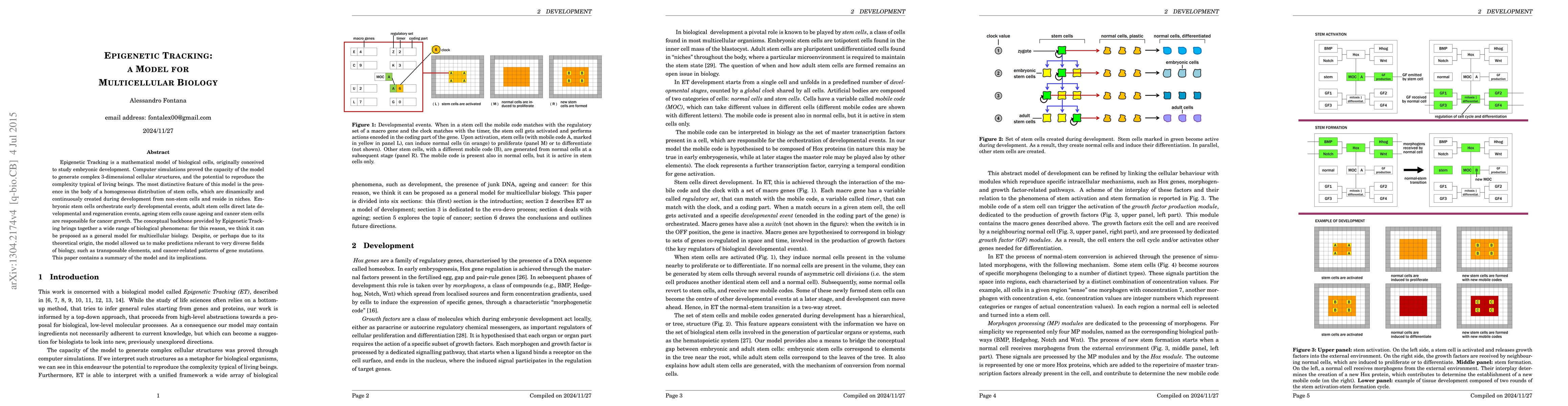 Epigenetic Tracking is a mathematical model of biological cells, originally conceived to study embryonic development. Computer simulations proved the capacity of the model to generate complex 3-dimensional cellular structures, and the potential to reproduce the complexity typical of living beings. The most distinctive feature of this model is the presence in the body of a homogeneous distribution of stem cells, which are dinamically and continuously created during development from non-stem cells and reside in niches. Embryonic stem cells orchestrate early developmental events, adult stem cells direct late developmental and regeneration events, ageing stem cells cause ageing and cancer stem cells are responsible for cancer growth. The conceptual backbone provided by Epigenetic Tracking brings together a wide range of biological phenomena: for this reason, we think it can be proposed as a general model for multicellular biology. Despite, or perhaps due to its theoretical origin, the model allowed us to make predictions relevant to very diverse fields of biology, such as transposable elements, and cancer-related patterns of gene mutations. This paper contains a summary of the model and its implications.