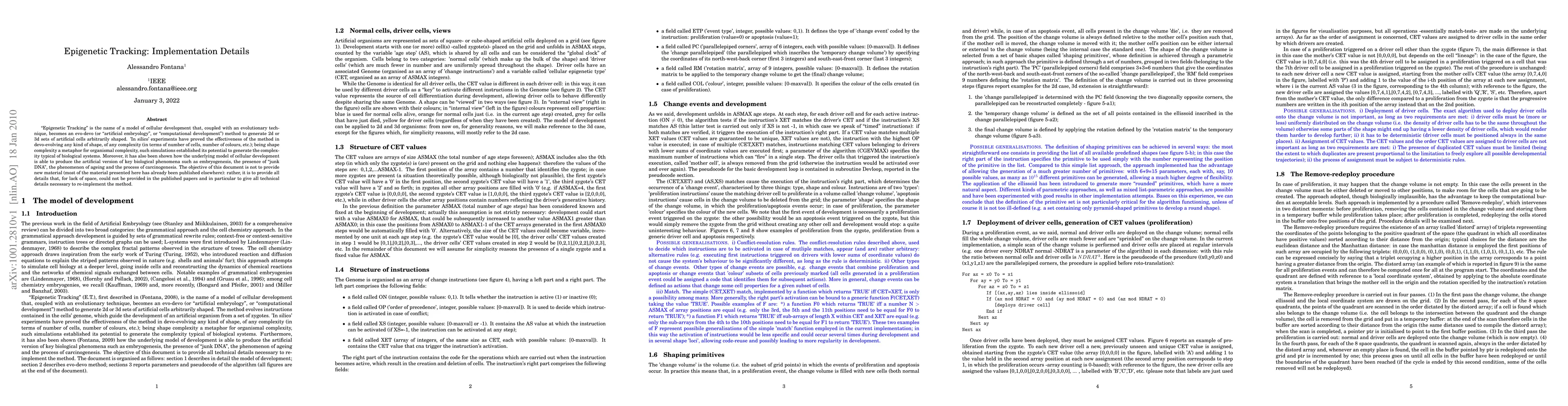 "Epigenetic Tracking" is the name of a model of cellular development that, coupled with an evolutionary technique, becomes an evo-devo (or "artificial embryology", or "computational development") method to generate 2d or 3d sets of artificial cells arbitrarily shaped. 'In silico' experiments have proved the effectiveness of the method in devo-evolving any kind of shape, of any complexity (in terms of number of cells, number of colours, etc.); being shape complexity a metaphor for organismal complexity, such simulations established its potential to generate the complexity typical of biological systems. Moreover, it has also been shown how the underlying model of cellular development is able to produce the artificial version of key biological phenomena such as embryogenesis, the presence of "junk DNA", the phenomenon of ageing and the process of carcinogenesis. The objective of this document is not to provide new material (most of the material presented here has already been published elsewhere): rather, it is to provide all details that, for lack of space, could not be provided in the published papers and in particular to give all technical details necessary to re-implement the method.