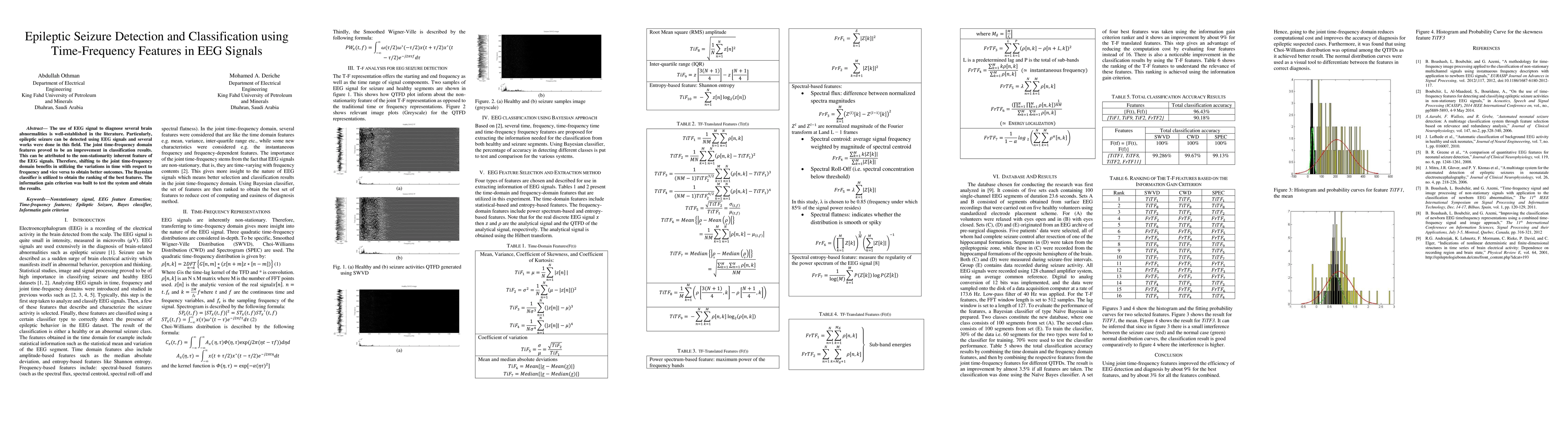 This paper explores the use of joint time-frequency features in EEG signals for epileptic seizure detection and classification, leveraging the non-stationarity of EEG data. A Bayesian classifier is employed to rank the best features, with the information gain criterion used to evaluate the system's performance.