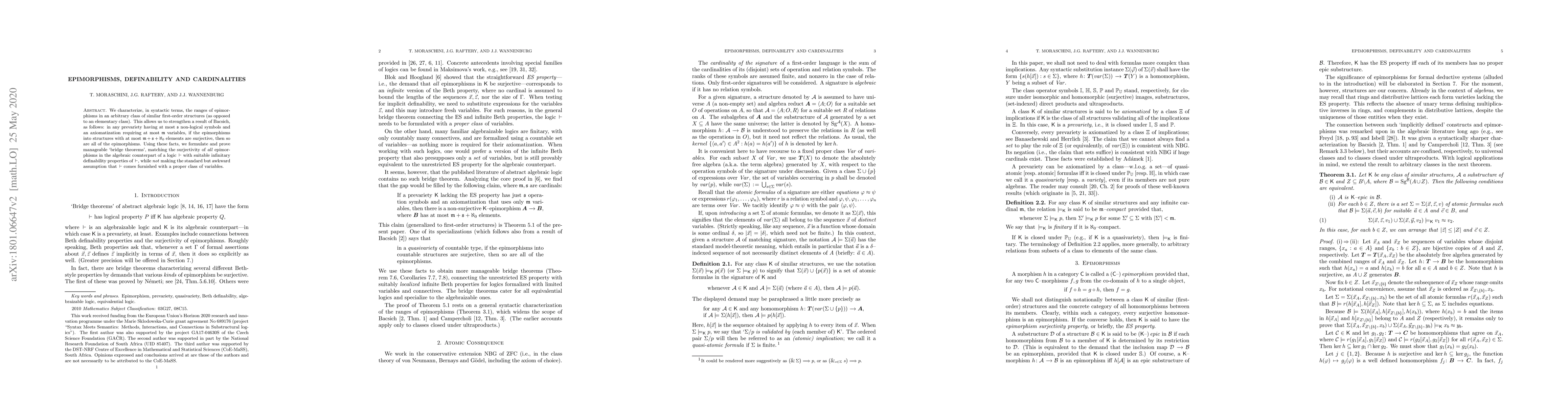 Generalizing a theorem of Campercholi, we characterize, in syntactic terms, the ranges of epimorphisms in an arbitrary class of similar first-order structures (as opposed to an elementary class). This allows us to strengthen a result of Isbell, as follows: in any prevariety having at most s non-logical symbols and an axiomatization requiring at most m variables, if the epimorphisms into structures with at most m + s + aleph0 elements are surjective, then so are all of the epimorphisms. Using these facts, we formulate and prove manageable "bridge theorems", matching the surjectivity of all epimorphisms in the algebraic counterpart of a logic L with suitable infinitary definability properties of L, while not making the standard but awkward assumption that L comes furnished with a proper class of variables.