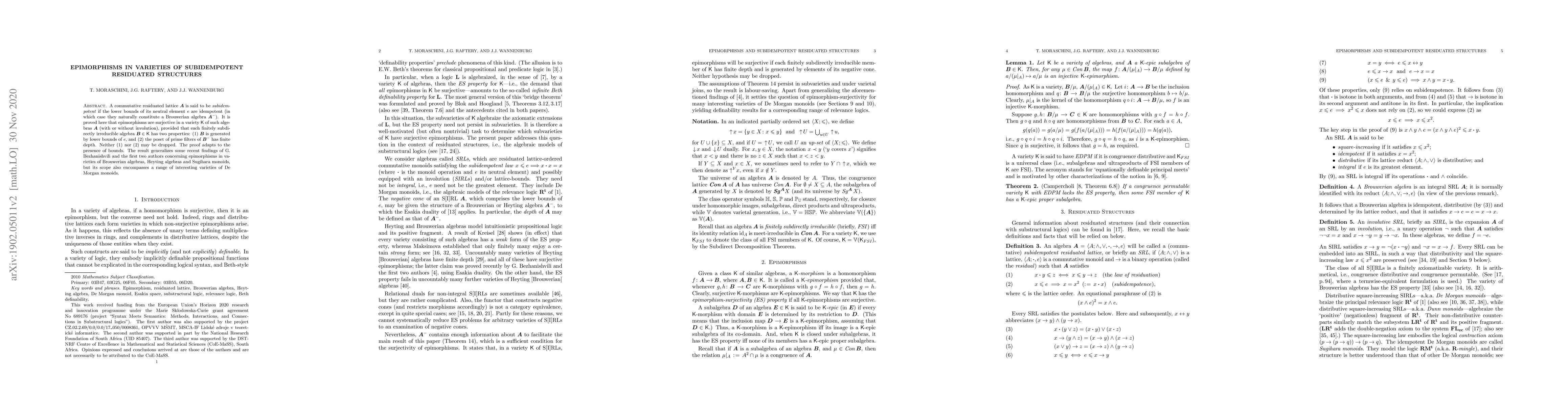 This paper proves that epimorphisms in varieties of subidempotent residuated structures are surjective if each finitely subdirectly irreducible algebra in the variety is generated by lower bounds of its neutral element and has a prime filter poset of finite depth. The result generalizes prior findings on Brouwerian and Heyting algebras to include De Morgan monoids.
