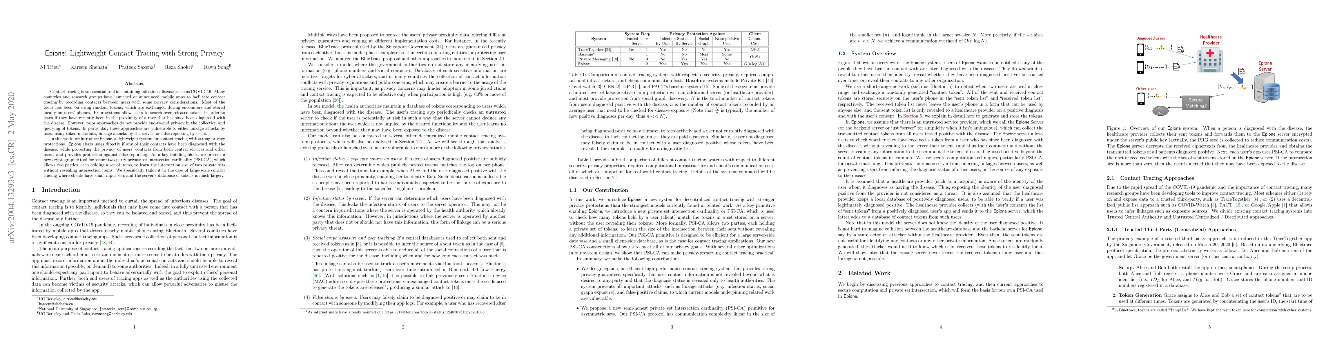 The research introduces Epione, a privacy-focused contact tracing system that directly alerts users about potential exposure to infectious diseases, without revealing contact details to central services or other users. It achieves this using a novel cryptographic tool for secure two-party private set intersection cardinality (PSI-CA), designed for large-scale contact tracing scenarios.