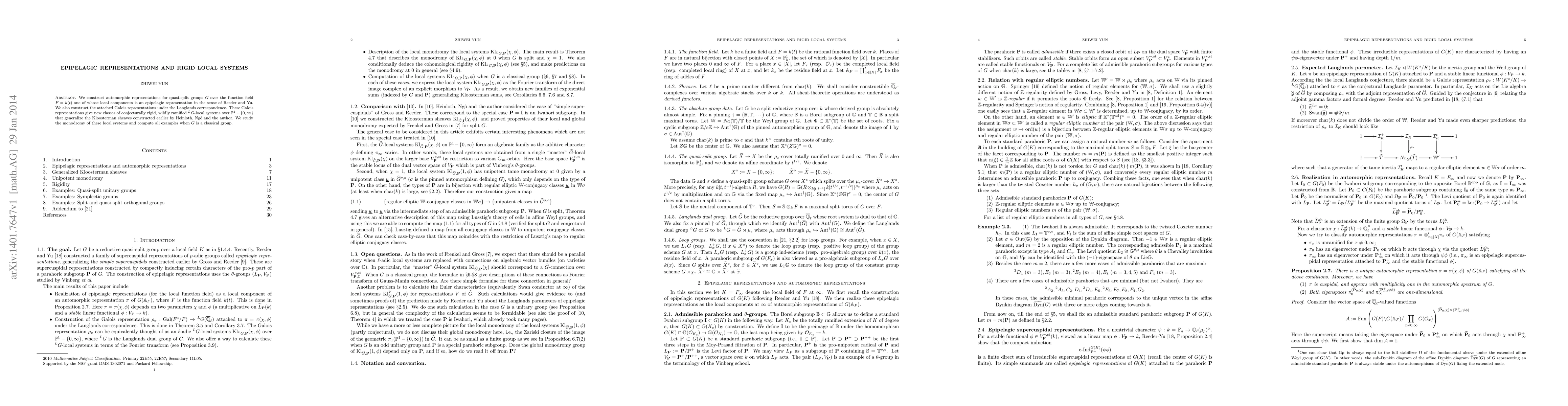 We construct automorphic representations for quasi-split groups $G$ over the function field $F=k(t)$ one of whose local components is an epipelagic representation in the sense of Reeder and Yu. We also construct the attached Galois representations under the Langlands correspondence. These Galois representations give new classes of conjecturally rigid, wildly ramified $^{L}G$-local systems over $\mathbb{P}^{1}-\{0,\infty\}$ that generalize the Kloosterman sheaves constructed earlier by Heinloth, Ng\^o and the author. We study the monodromy of these local systems and compute all examples when $G$ is a classical group.