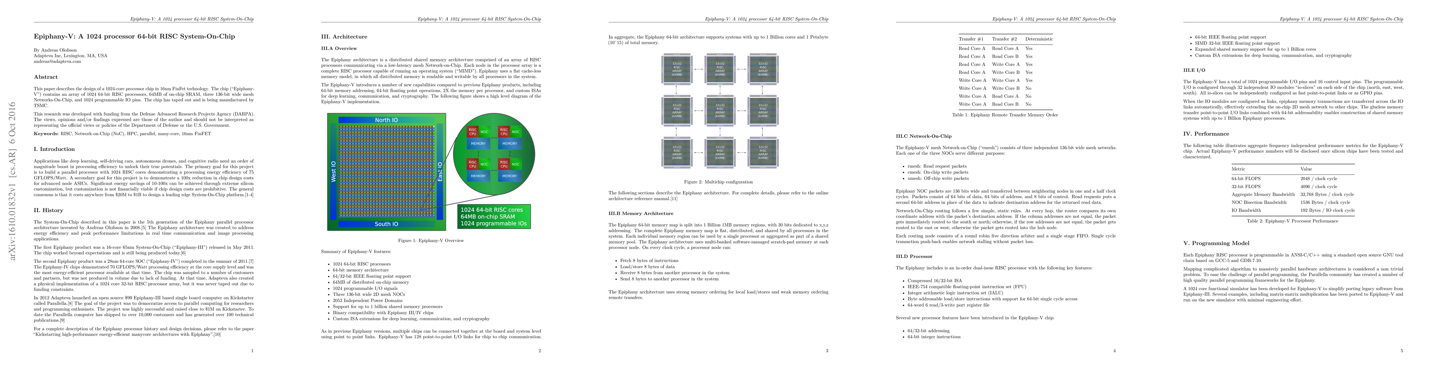 This paper details the design of Epiphany-V, a 1024-core 64-bit RISC processor chip in 16nm FinFet technology, featuring extensive on-chip SRAM and multiple communication networks, funded by DARPA. The chip has completed design and is set for manufacturing.