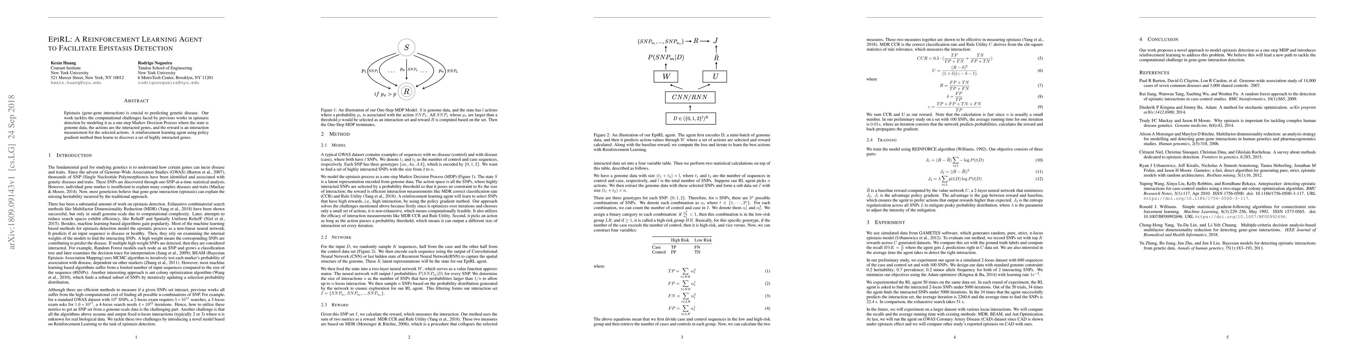 Epistasis (gene-gene interaction) is crucial to predicting genetic disease. Our work tackles the computational challenges faced by previous works in epistasis detection by modeling it as a one-step Markov Decision Process where the state is genome data, the actions are the interacted genes, and the reward is an interaction measurement for the selected actions. A reinforcement learning agent using policy gradient method then learns to discover a set of highly interacted genes.