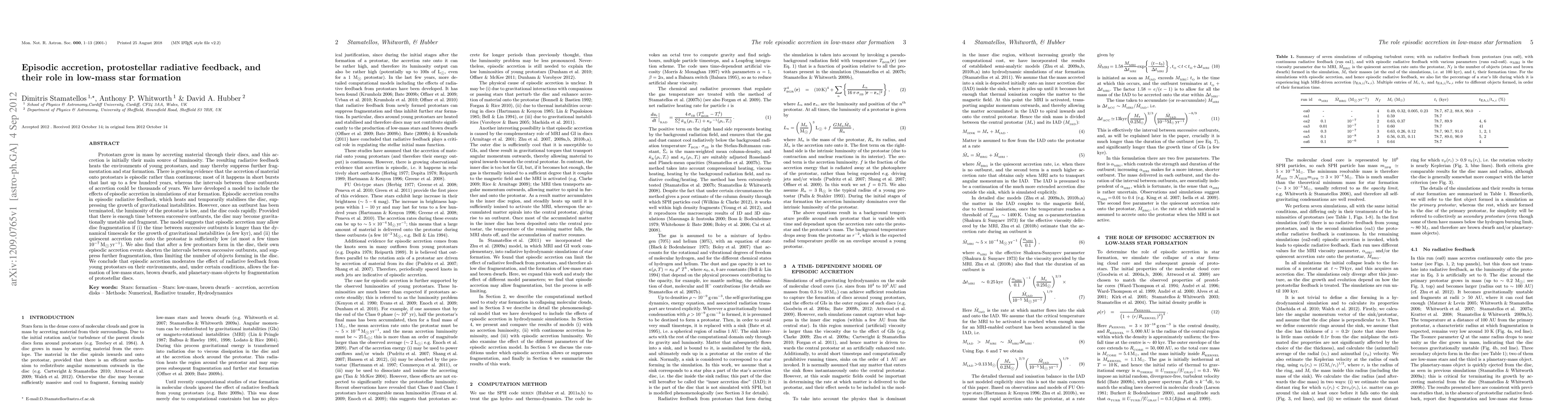 This paper models episodic accretion in protostellar discs, showing that it leads to intermittent radiative feedback, which can temporarily stabilize the disc and suppress gravitational instabilities. The study finds that sufficient time between accretion bursts allows for disc fragmentation, facilitating the formation of low-mass stars, brown dwarfs, and planetary-mass objects.