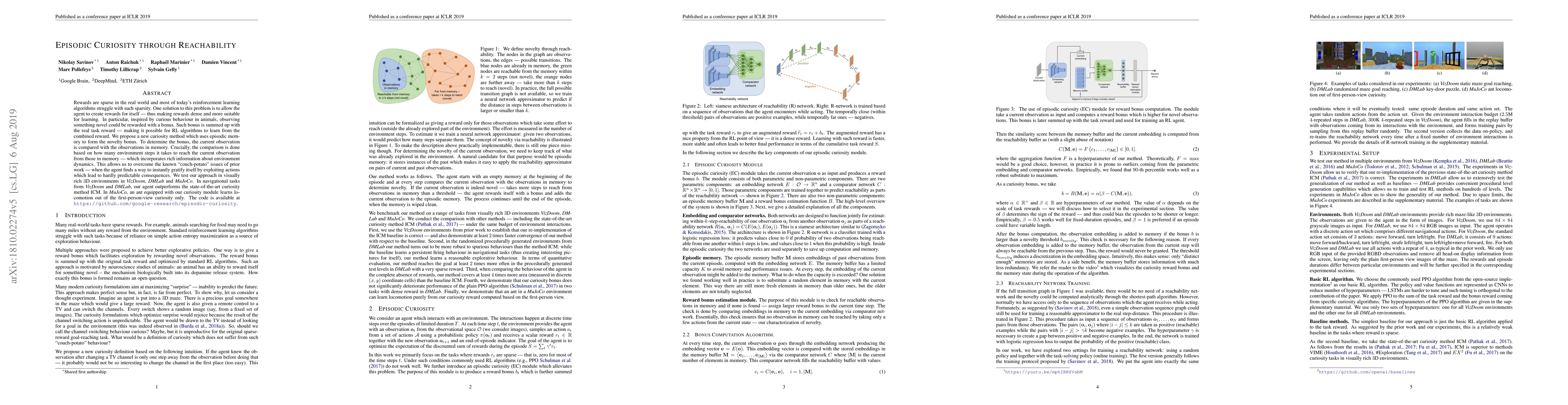 Rewards are sparse in the real world and most of today's reinforcement learning algorithms struggle with such sparsity. One solution to this problem is to allow the agent to create rewards for itself - thus making rewards dense and more suitable for learning. In particular, inspired by curious behaviour in animals, observing something novel could be rewarded with a bonus. Such bonus is summed up with the real task reward - making it possible for RL algorithms to learn from the combined reward. We propose a new curiosity method which uses episodic memory to form the novelty bonus. To determine the bonus, the current observation is compared with the observations in memory. Crucially, the comparison is done based on how many environment steps it takes to reach the current observation from those in memory - which incorporates rich information about environment dynamics. This allows us to overcome the known "couch-potato" issues of prior work - when the agent finds a way to instantly gratify itself by exploiting actions which lead to hardly predictable consequences. We test our approach in visually rich 3D environments in ViZDoom, DMLab and MuJoCo. In navigational tasks from ViZDoom and DMLab, our agent outperforms the state-of-the-art curiosity method ICM. In MuJoCo, an ant equipped with our curiosity module learns locomotion out of the first-person-view curiosity only.