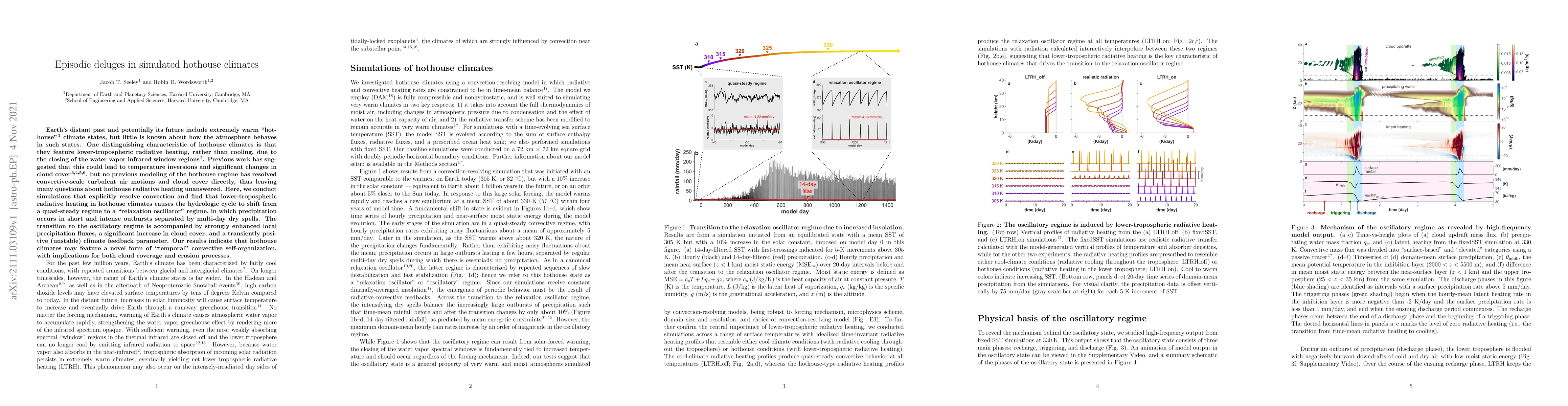 This research investigates the atmospheric behavior in hothouse climates, finding that lower-tropospheric radiative heating leads to a shift in the hydrologic cycle into an oscillatory regime characterized by episodic deluges and prolonged dry spells. The study highlights the implications for cloud cover and erosion processes due to this novel form of convective self-organization.