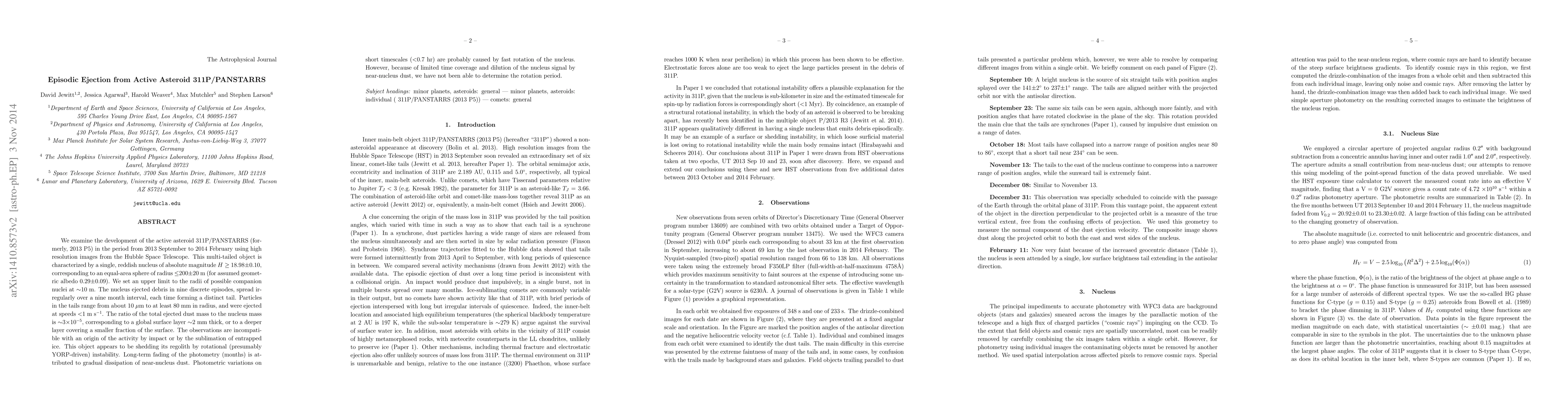 This study analyzes the episodic ejection of debris from the active asteroid 311P/PANSTARRS, revealing nine distinct tail-forming events over nine months. The ejected particles range from 10 µm to 80 mm, suggesting a regolith shedding mechanism driven by rotational instability, likely YORP.